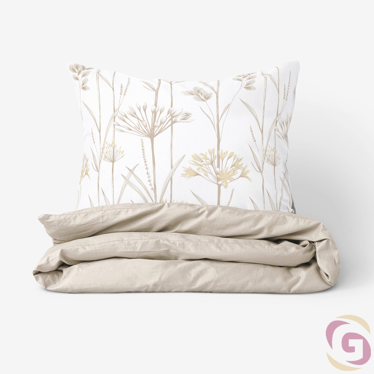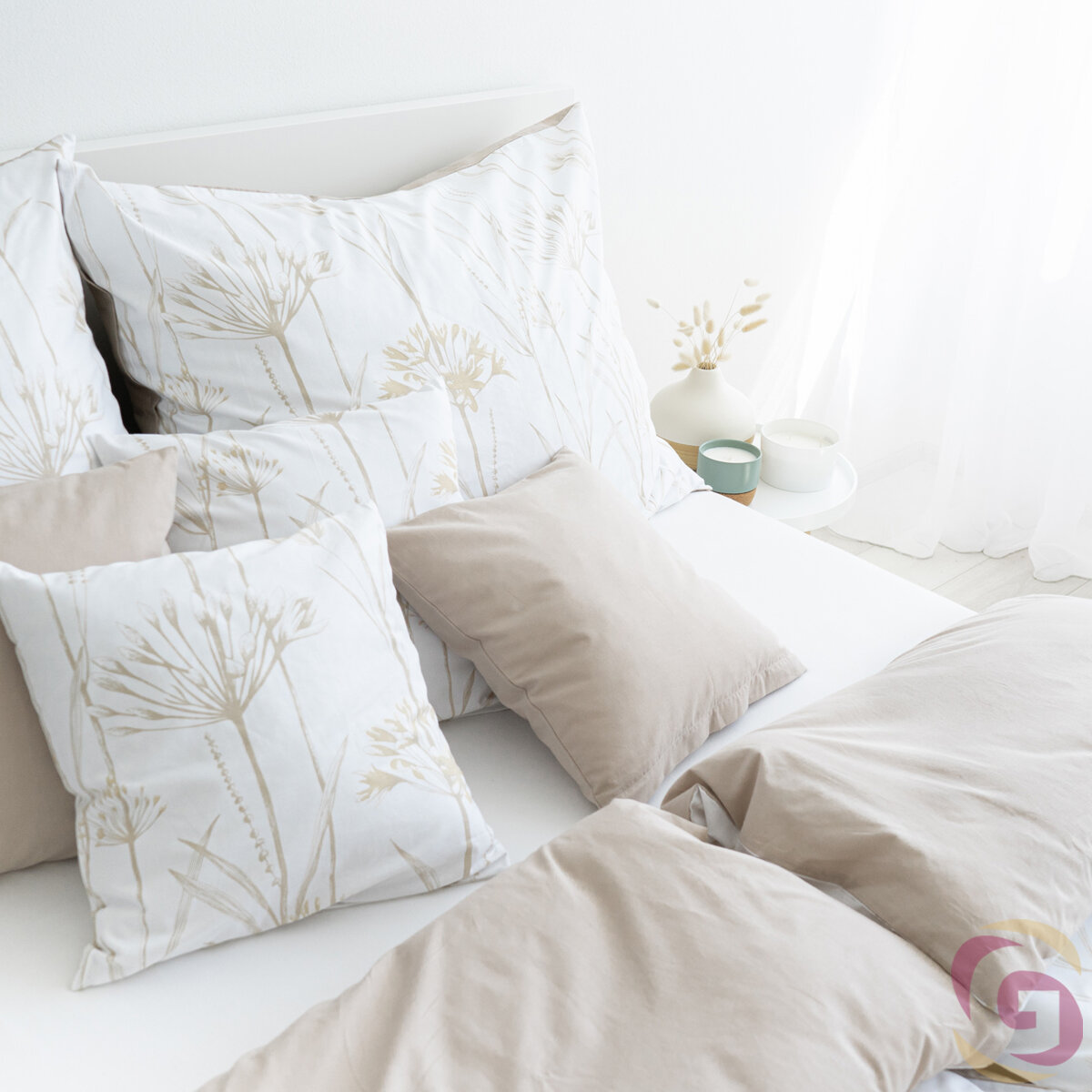 Die Bettwäsche hat auf der einen Seite ein beigefarbenes Dekorpflanzen-Motiv und auf der anderen Seite ein einfarbige Farbe latte (gilt für die gesamte Bettwäsche - Kopfkissenbezug und Deckenbezug). Komplettieren Sie Ihr Schlafzimmer mit dieser einzigartigen doppelseitigen Baumwollbettwäsche aus der Kollektion Duo. Die Bettwäsche ist aus glatter 100%iger Baumwolle mit einem Gewicht von 145 g/m2 hergestellt.