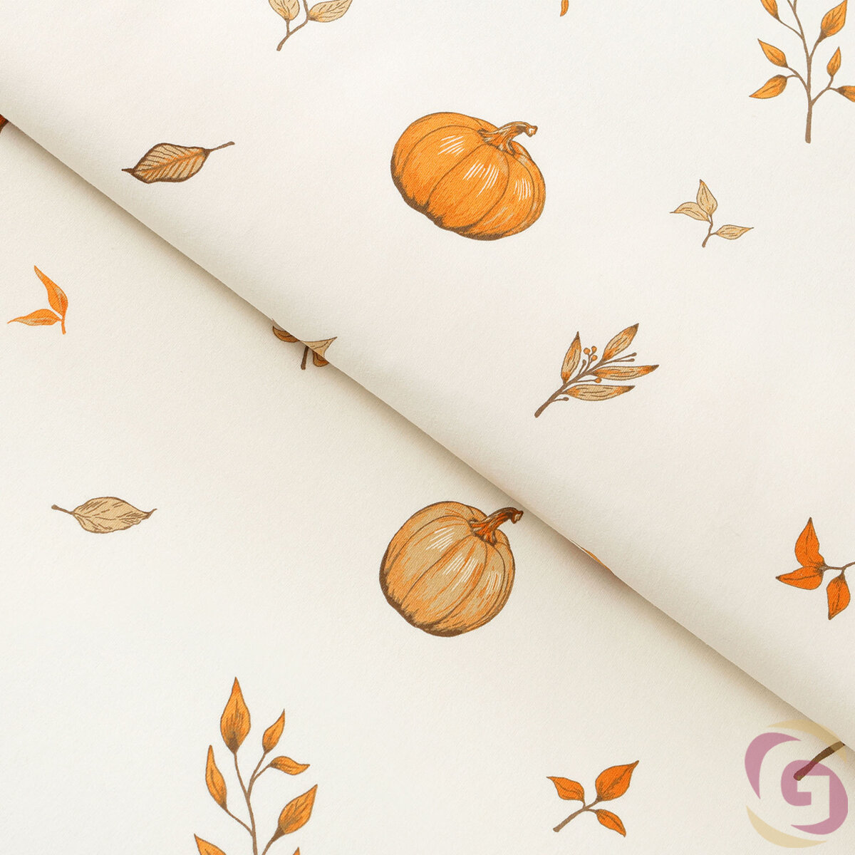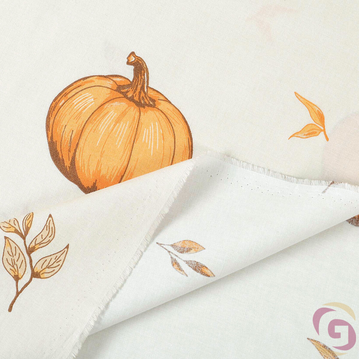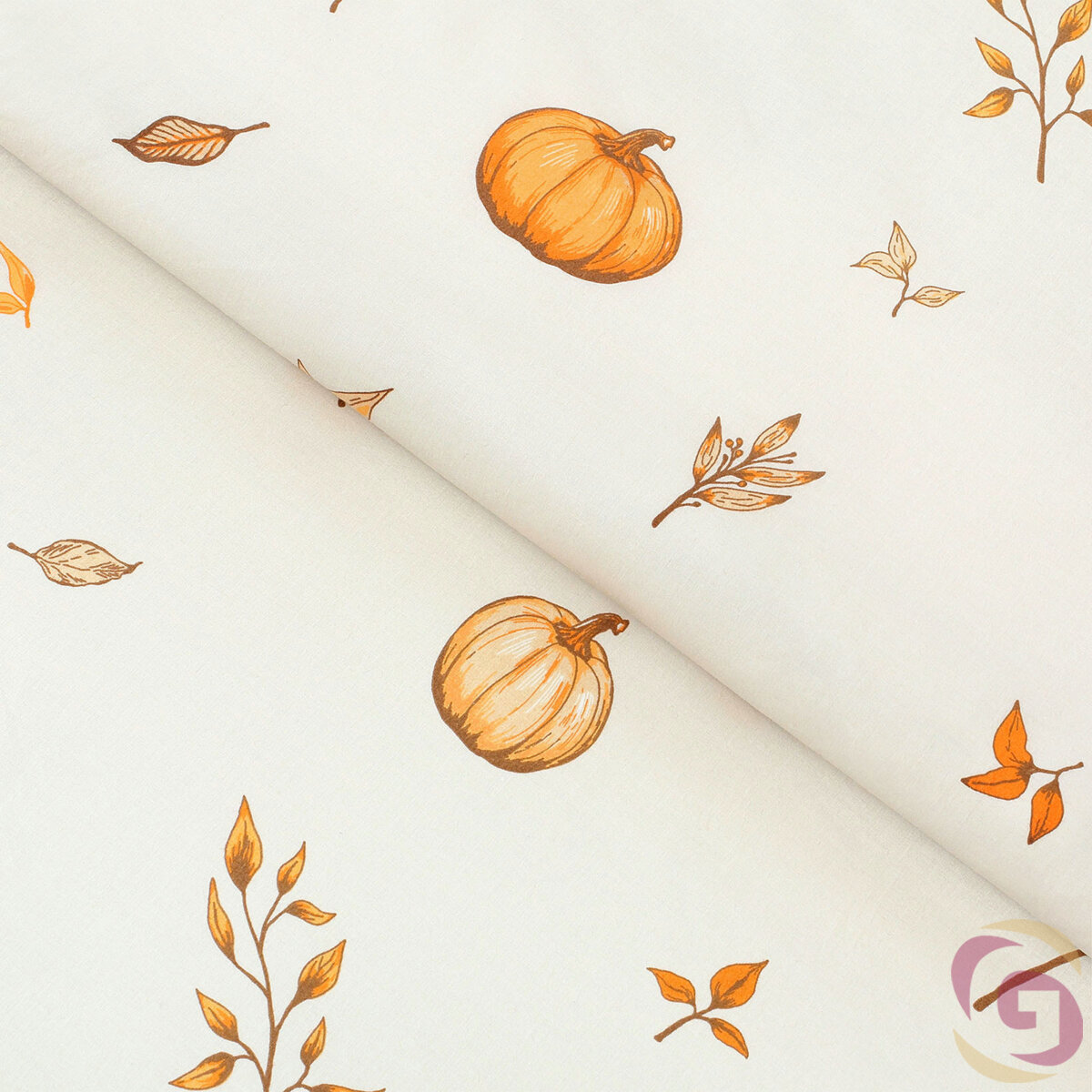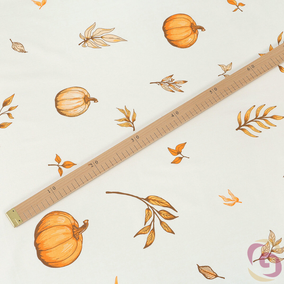 Baumwollstoff mit Herbstkürbisse und Blätter. Die Breite des Stoffes beträgt 160 cm. Die Hintergrundfarbe ist elfenbeinem. Der Stoff besteht aus hochwertiger, glatter 100 % Baumwolle mit einem Gewicht von 145 g/m2 . Der Baumwollstoff wird als Meterware angeboten, die Mindestabnahmemenge beträgt 0,5 m. Wir bieten auch weitere Produkte aus Baumwollstoff mit Herbstkürbisse und Blätter an.