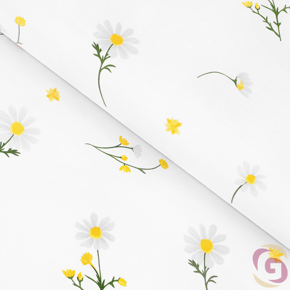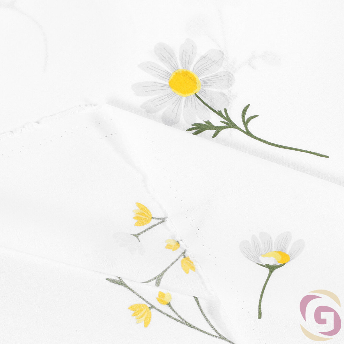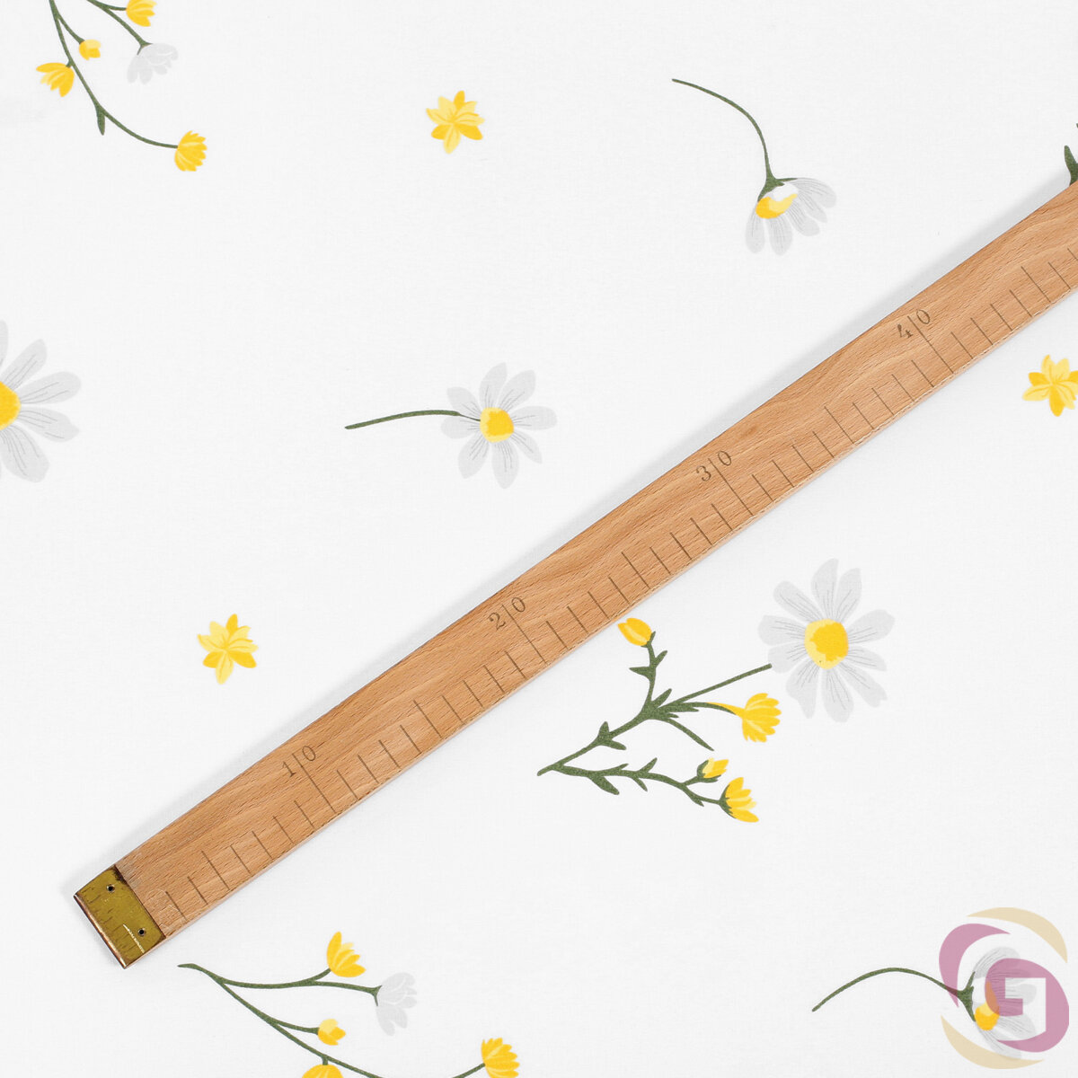 Baumwollstoff mit Kamillen-Motiv. Die Breite des Stoffes beträgt 160 cm, die Hintergrundfarbe ist weiß. Der Stoff besteht aus hochwertiger, glatter 100 % Baumwolle mit einem Gewicht von 145 g/m2. Der Baumwollstoff wird als Meterware angeboten, die Mindestabnahmemenge beträgt 0,5 m. Wir bieten auch weitere Produkte aus Baumwollstoff mit Kamillen-Motiv an.