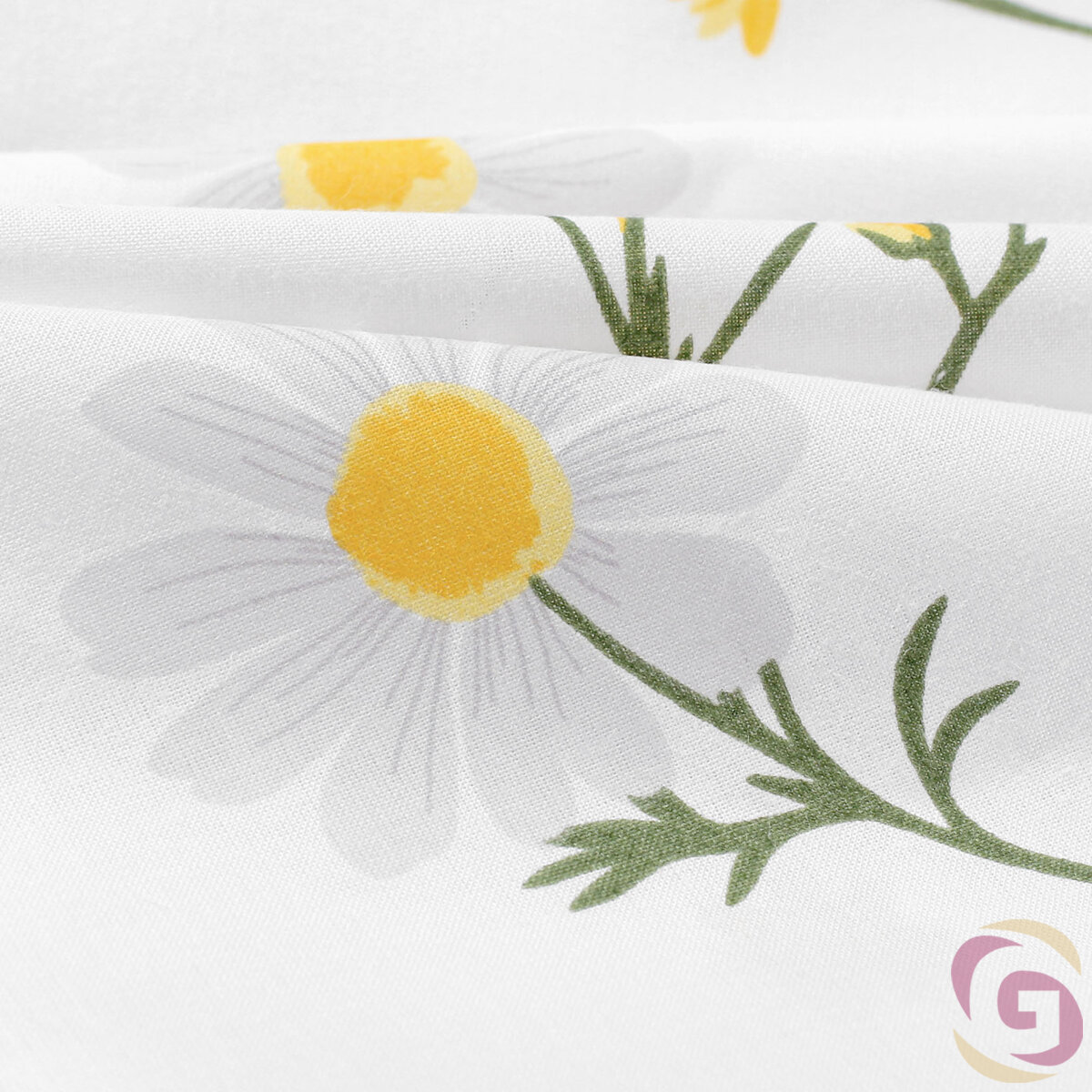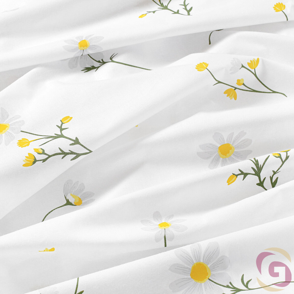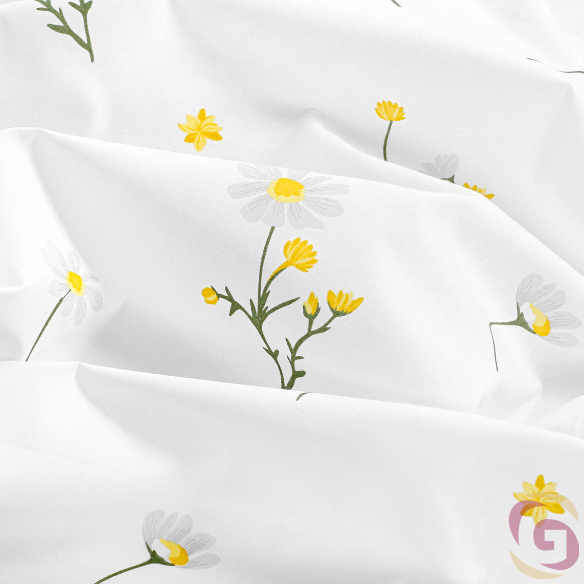 Baumwollstoff mit Kamillen-Motiv. Die Breite des Stoffes beträgt 160 cm, die Hintergrundfarbe ist weiß. Der Stoff besteht aus hochwertiger, glatter 100 % Baumwolle mit einem Gewicht von 145 g/m2. Der Baumwollstoff wird als Meterware angeboten, die Mindestabnahmemenge beträgt 0,5 m. Wir bieten auch weitere Produkte aus Baumwollstoff mit Kamillen-Motiv an.