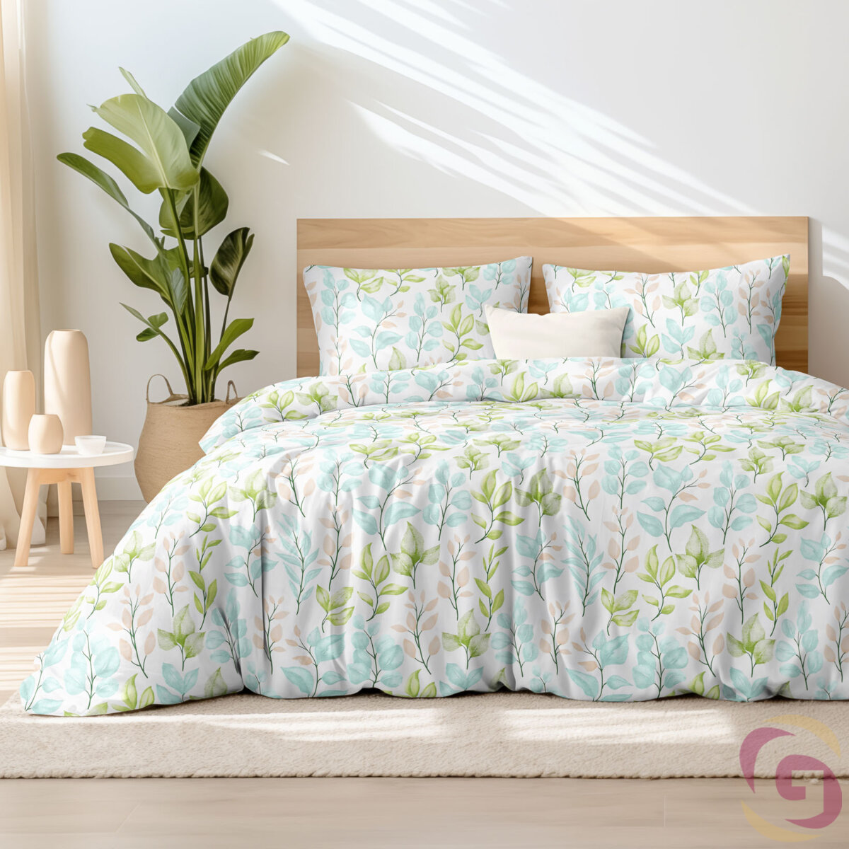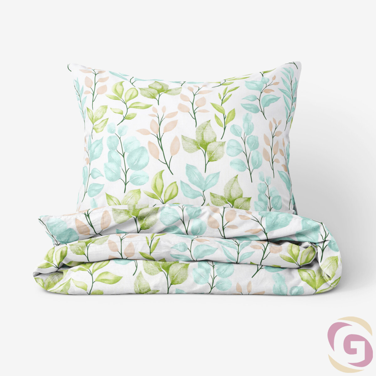 Bettwäsche mit Motiv von mit Motiv bemalte Blätter wird eine schöne Dekoration für Ihr Schlafzimmer sein. Es ist aus 100 % glatter Baumwolle mit einem Gewicht von 145 g/m2 hergestellt.
