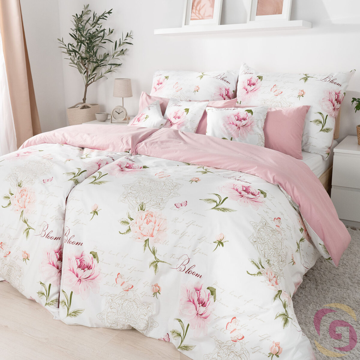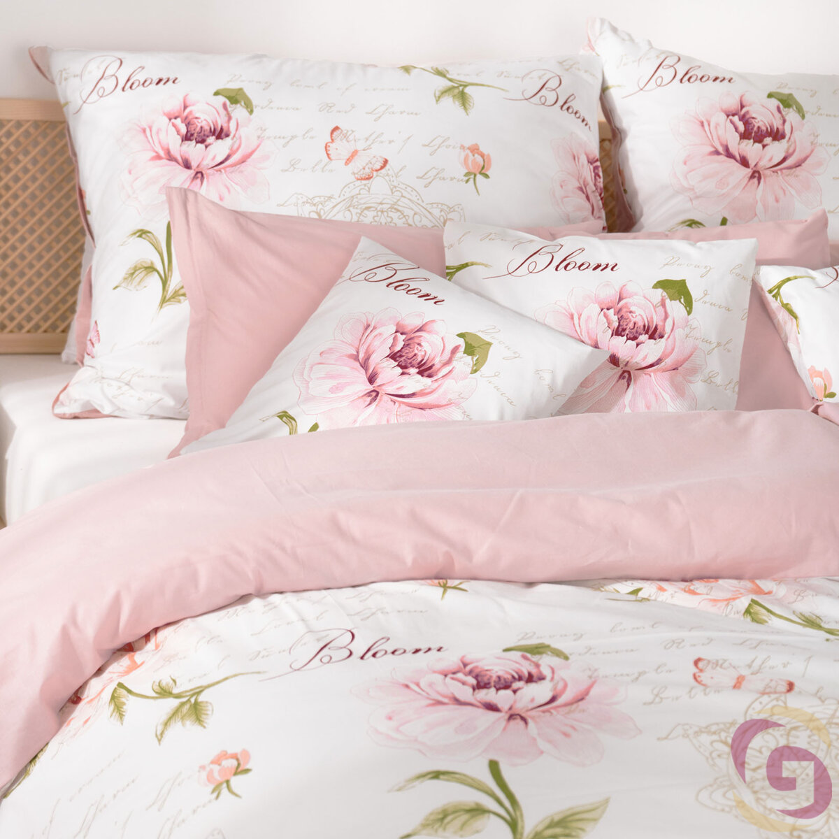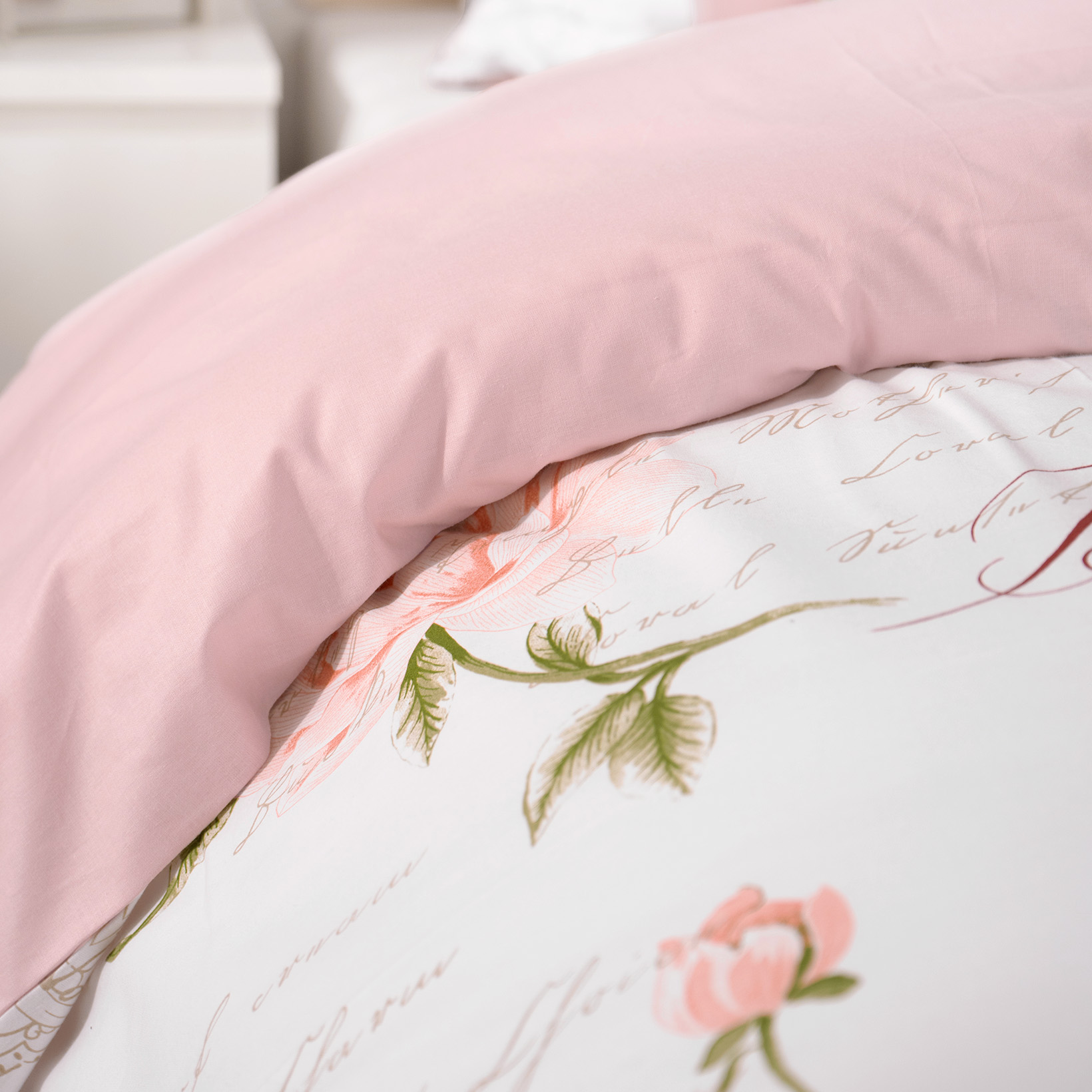 Bettwäsche aus Baumwolle Duo - Pfingstrosen und Schriftzügen mit Puderrosa