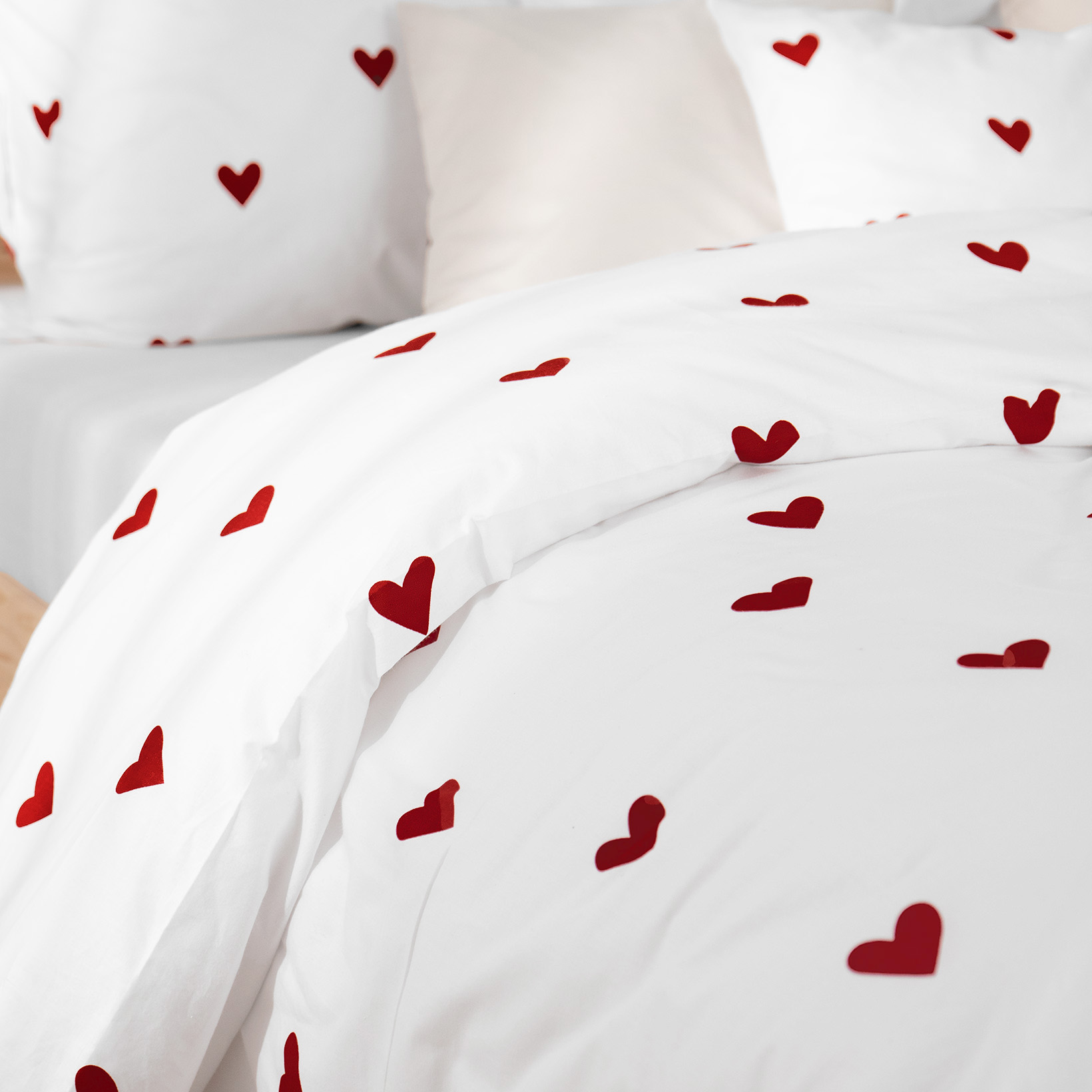 Die Liebe liegt in der Luft, und bald könnte sie auch in Ihrem Schlafzimmer sein! Verlieben Sie sich in das romantische Motiv rote Herzchen auf weißem Hintergrund und schaffen Sie eine harmonische Atmosphäre in Ihrem Schlafzimmer.