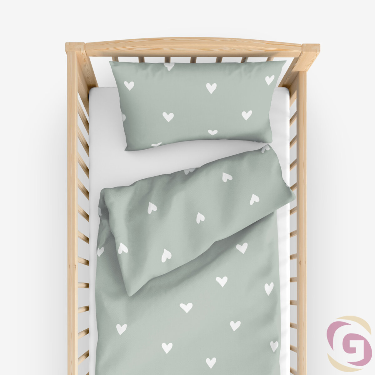 Bettwäsche für Babybetten aus Baumwolle - Herzchen auf Salbeigrün