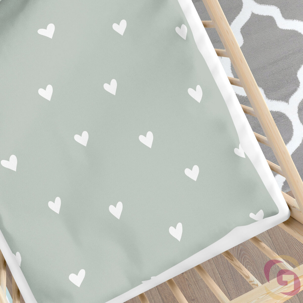 Spannbetttuch aus Baumwolle für Babybetten - Herzchen auf Salbeigrün