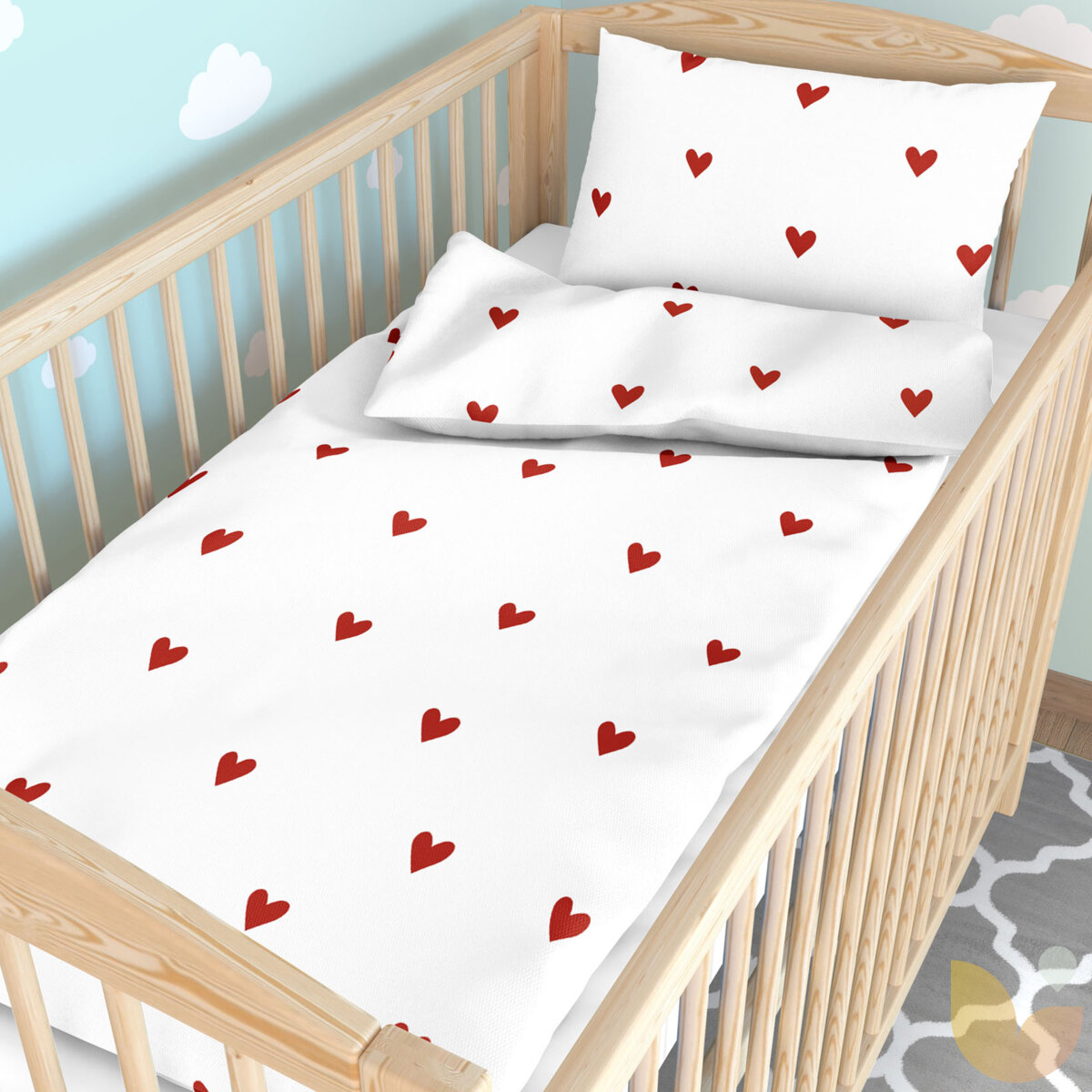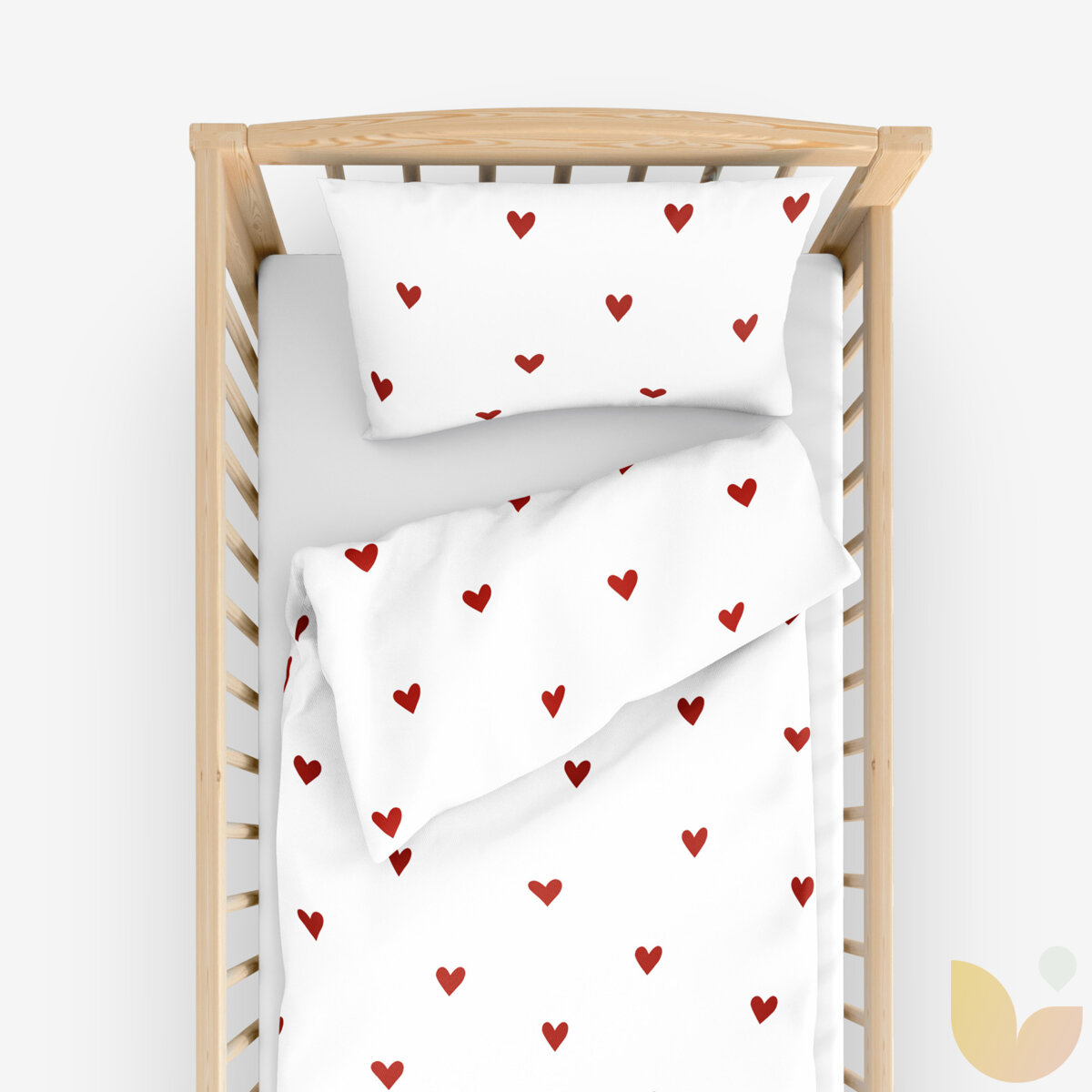 Bettwäsche für Babybetten aus Baumwolle - Rote Herzchen auf Weiß
