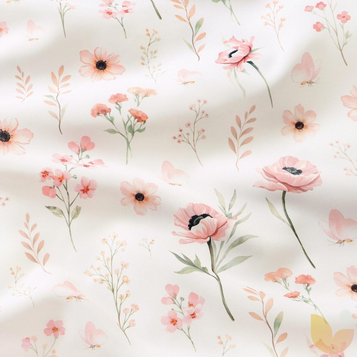 Das Motiv zarter Blumen und Schmetterlinge verleiht dem Kissenbezug ein leichtes, romantisches Aussehen. Der helle Hintergrund in Kombination mit pastellfarbenen Tönen wirkt luftig und ruhig, wodurch sich der Bezug für den täglichen Gebrauch im Wohnbereich eignet.