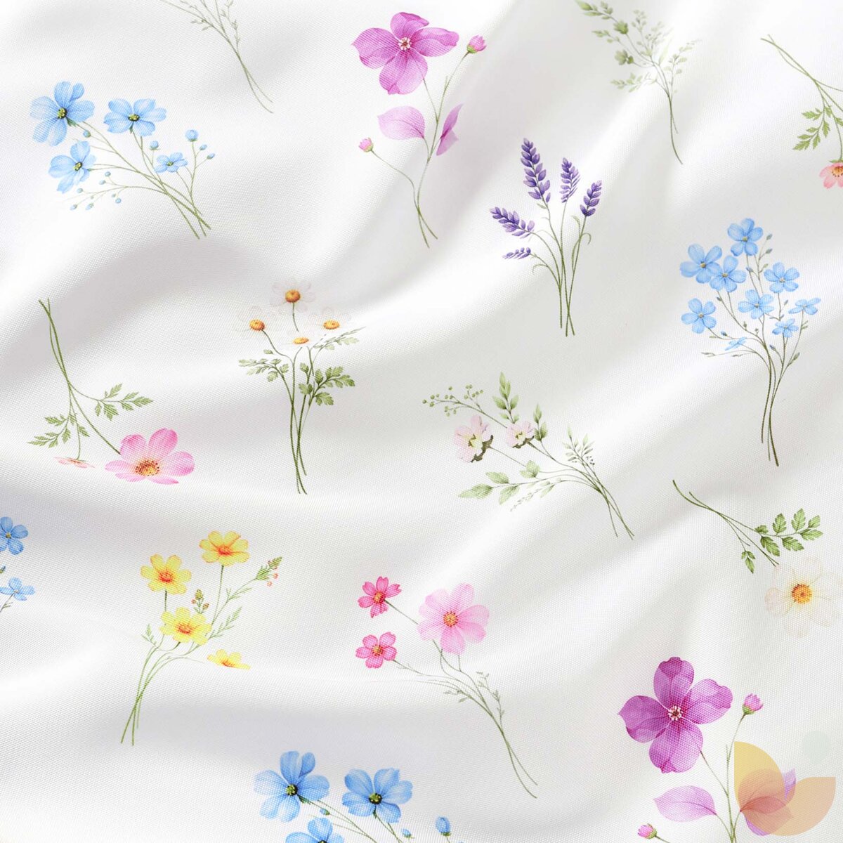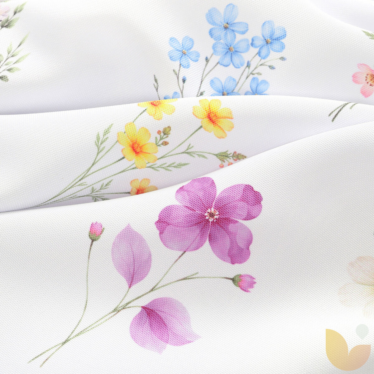 Dekorativer Vorhang mit Teflonbeschichtung und Muster bunten Blumenmuster auf weißem Hintergrund. Dieser Vorhang wird von uns angefertigt aus dekorativem Stoff mit Teflonbeschichtung aus 100 % Polyester – Blumengarten.