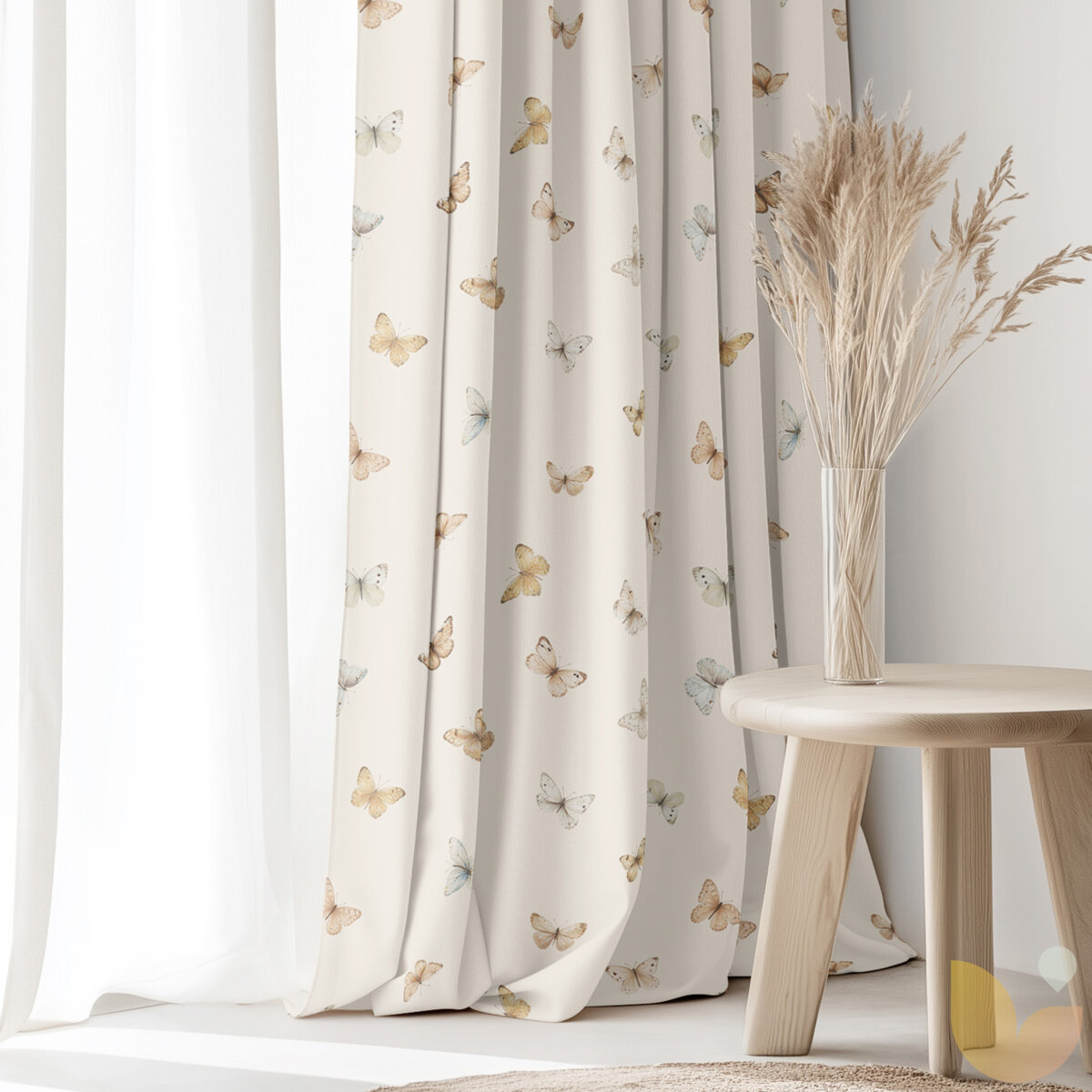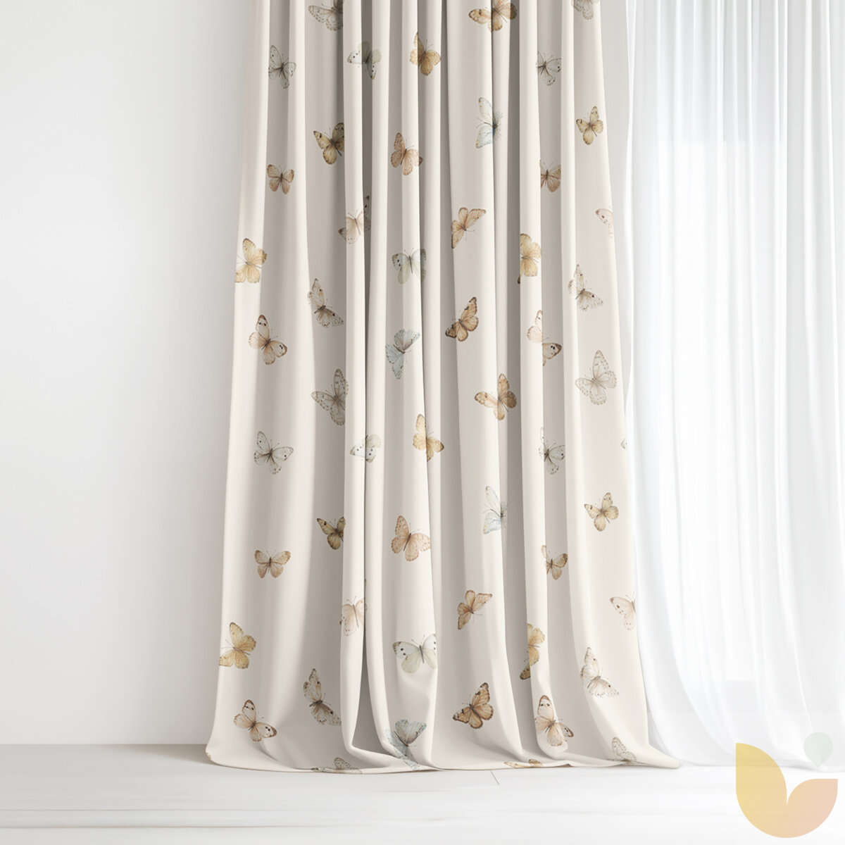 Dekorativer Vorhang mit Teflonbeschichtung und Muster von Schmetterlingen auf cremefarbenem Hintergrund. Dieser Vorhang wird von uns angefertigt aus dekorativem Stoff mit Teflonbeschichtung aus 100 % Polyester – Schmetterlinge.