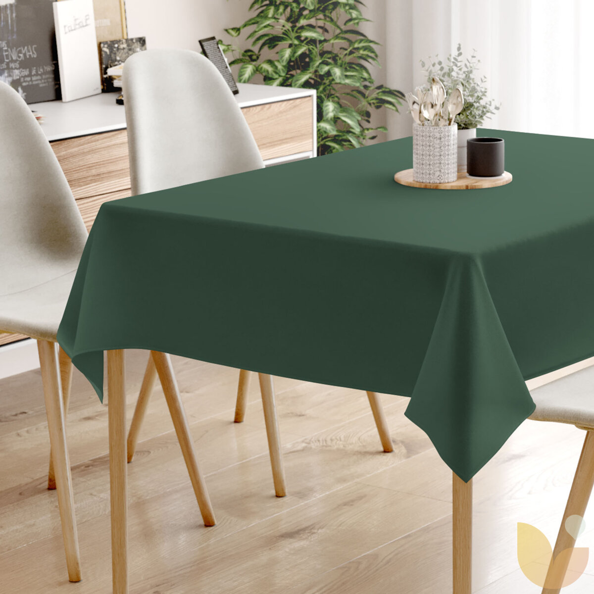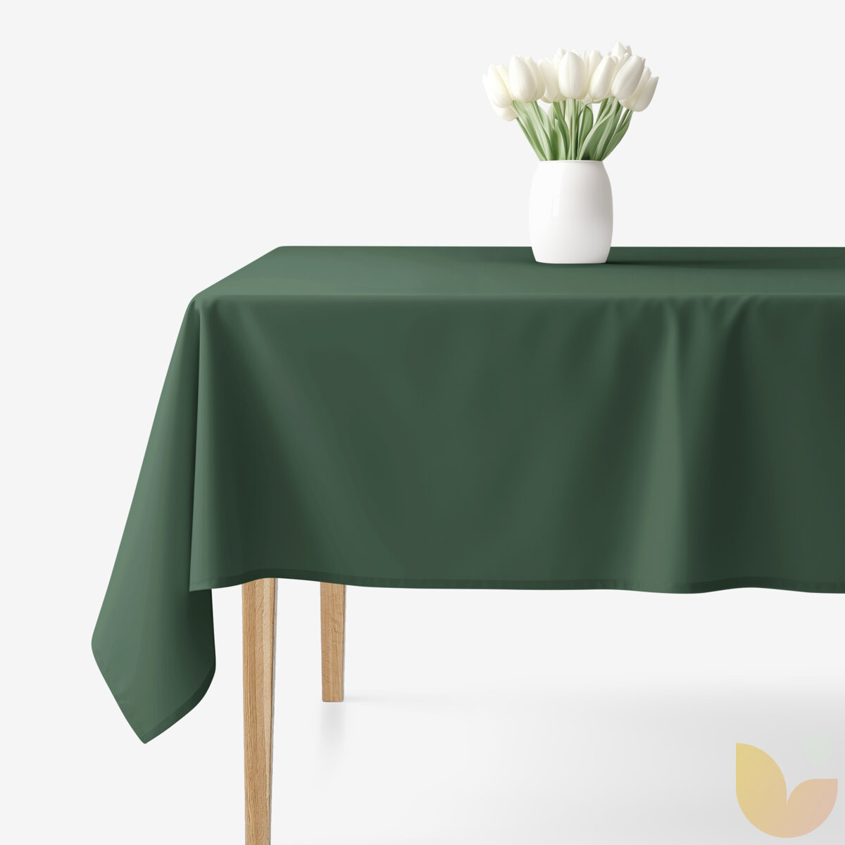 Die dunkelgrüne Baumwolltischdecke aus 100 % Baumwollgewebe mit einem Gewicht von 145 g/m2. Die Tischdecke ist rundum gesäumt.