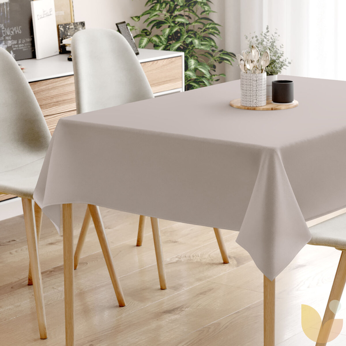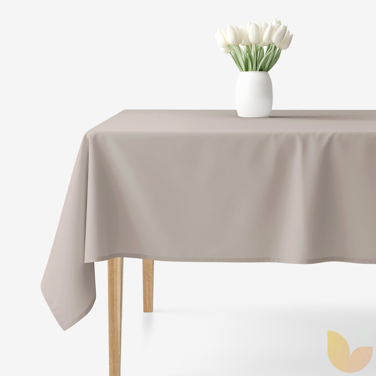 Die eckige Tischdecke in Farbe graubraun aus 100 % Baumwollgewebe mit einem Gewicht von 145 g/m2. Die Tischdecke ist rundum gesäumt.