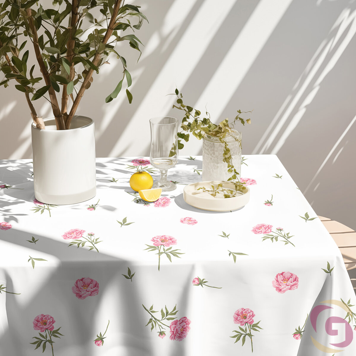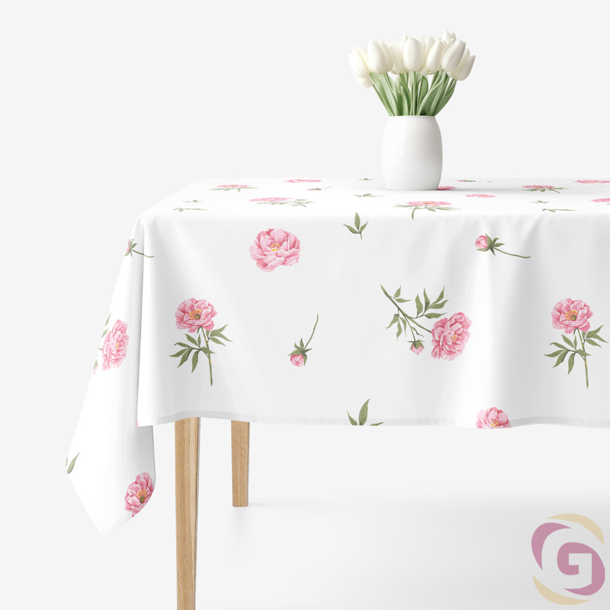 Die eckige Tischdecke aus Baumwolle mit Pfingstrosen auf weißem Hintergrund. Sie ist aus hochwertiger 100%iger Baumwolle (Gewicht 145g/m2) hergestellt. Die Tischdecke ist sehr formstabil und passt auf jeden quadratischen Tisch. Diese Tischdecke schmückt perfekt Ihr Interieur.