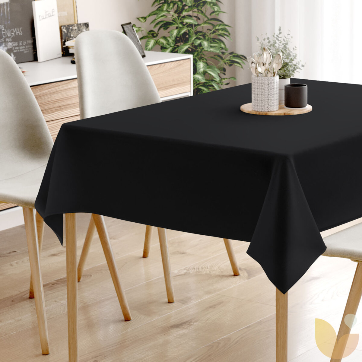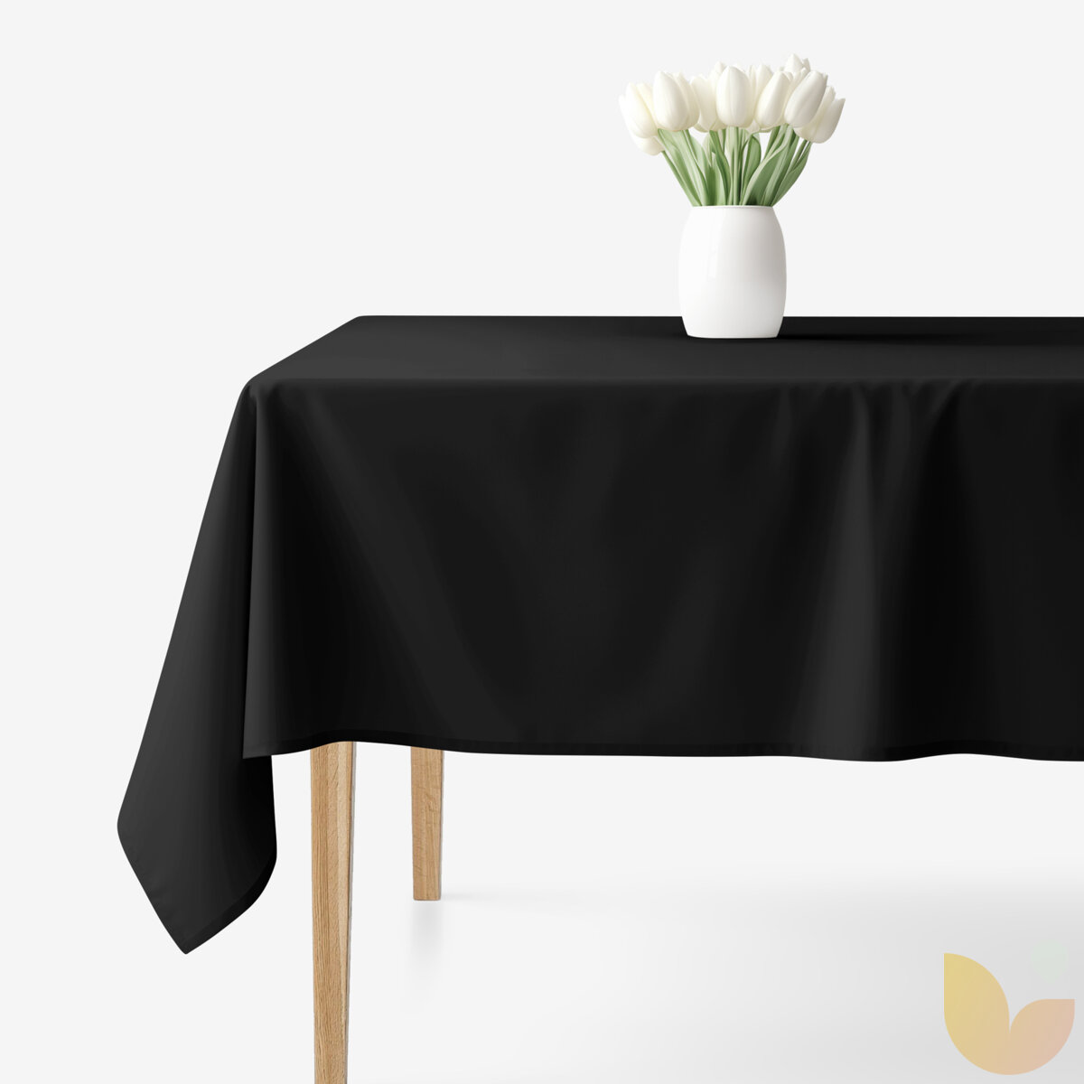 Die eckige Tischdecke in Farbe schwarz aus 100 % Baumwollgewebe mit einem Gewicht von 145 g/m2. Die Tischdecke ist rundum gesäumt.