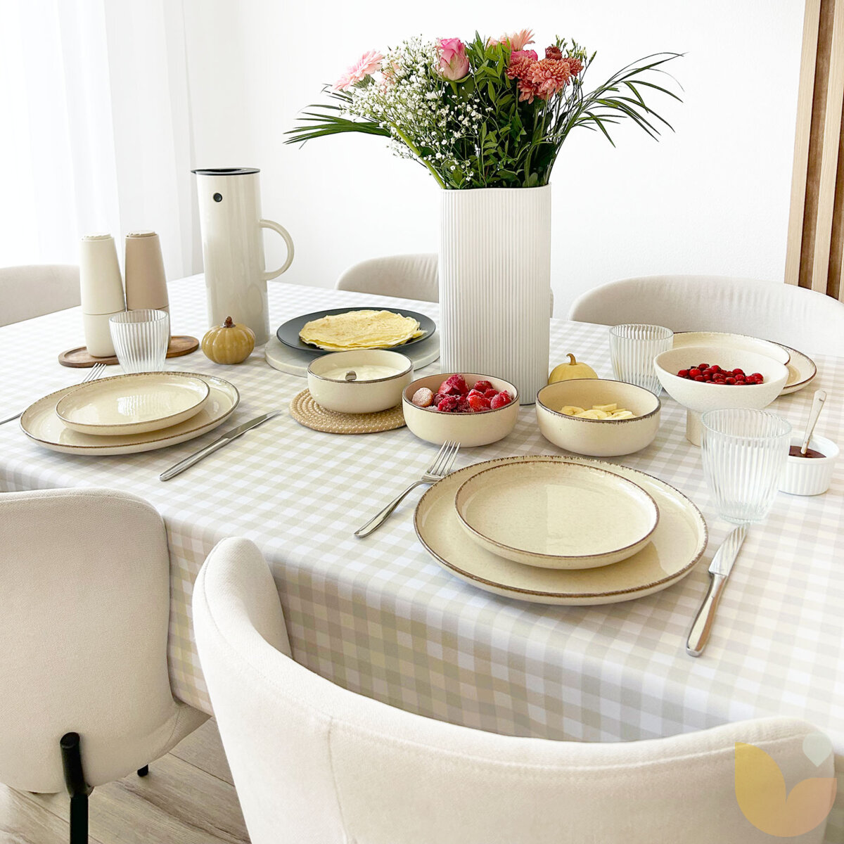 Die Tischdecke sollte auf jeder Seite mindestens 15 - 20 cm über die Tischkante hinausragen. Wenn Sie einen Tisch mit den Maßen 90 x 130 cm haben, empfehlen wir, eine Tischdecke mit den Maßen von mindestens 120 x 160 cm zu kaufen.