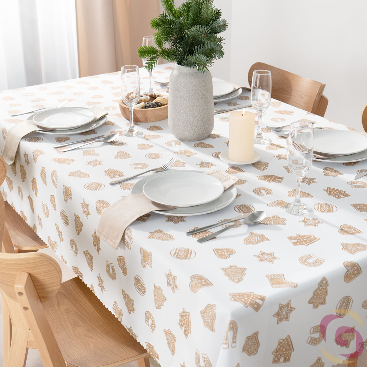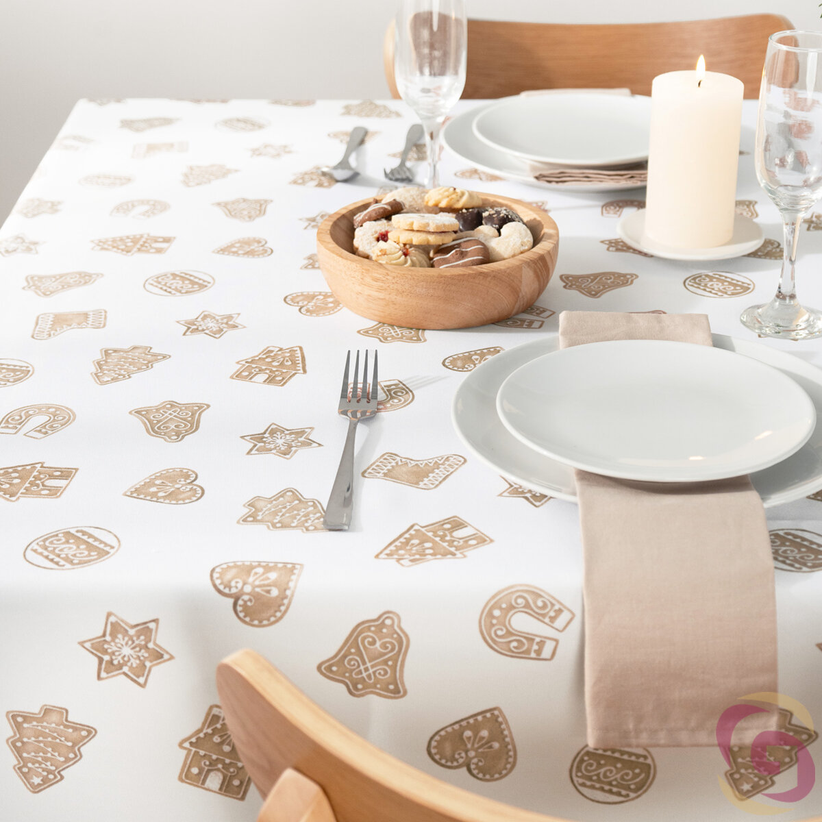 Tischdecke aus der Kollektion mit Lebkuchenmuster auf weißem Untergrund. Das verspielte Lebkuchenmotiv bringt eine gemütliche Weihnachtsstimmung in Ihr Zuhause und ergänzt festliche Dekorationen perfekt.
