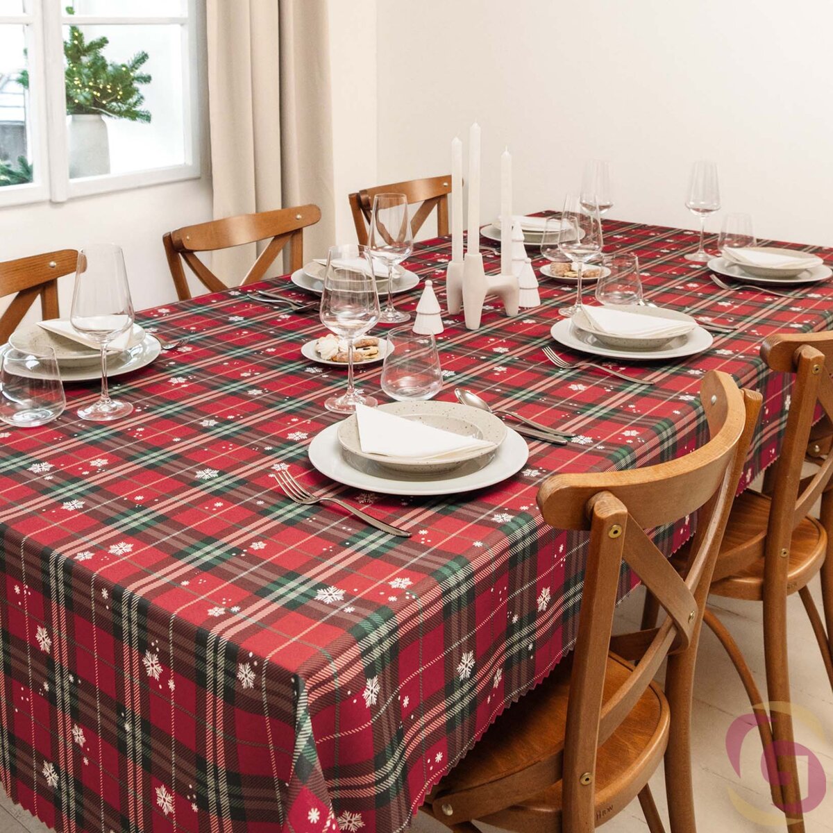 Das Tischdecke ist mit einem klassischen Karomuster in Rot, Grün und Weiß verziert, mit fein verteilten weißen Schneeflocken, die einen dezenten winterlichen Akzent setzen. Die Kombination aus traditionellem Karomotiv und kleinen Flocken schafft eine festliche und gemütliche Atmosphäre, ideal für weihnachtliche Dekorationen.
