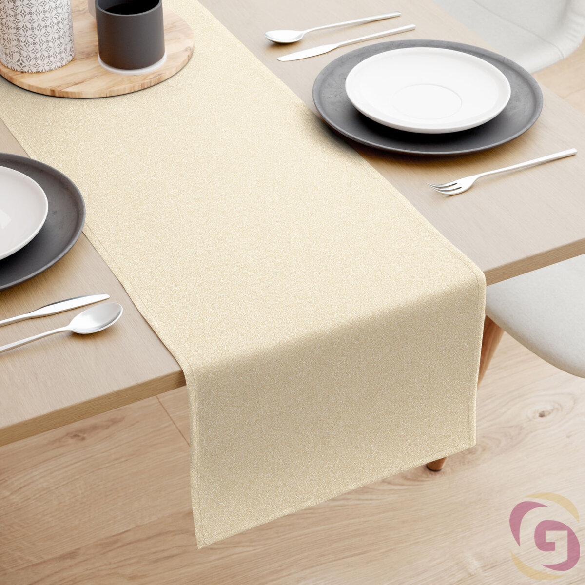 Goldener exklusiver Tischläufer mit Teflonbeschichtung aus hochwertigem 100% Polyesterstoff mit einem Flächengewicht von 205 g/m². Der Läufer ist rundum gesäumt. Er ist ein sehr praktisches und modernes Accessoire für den Ess- oder Konferenztisch.