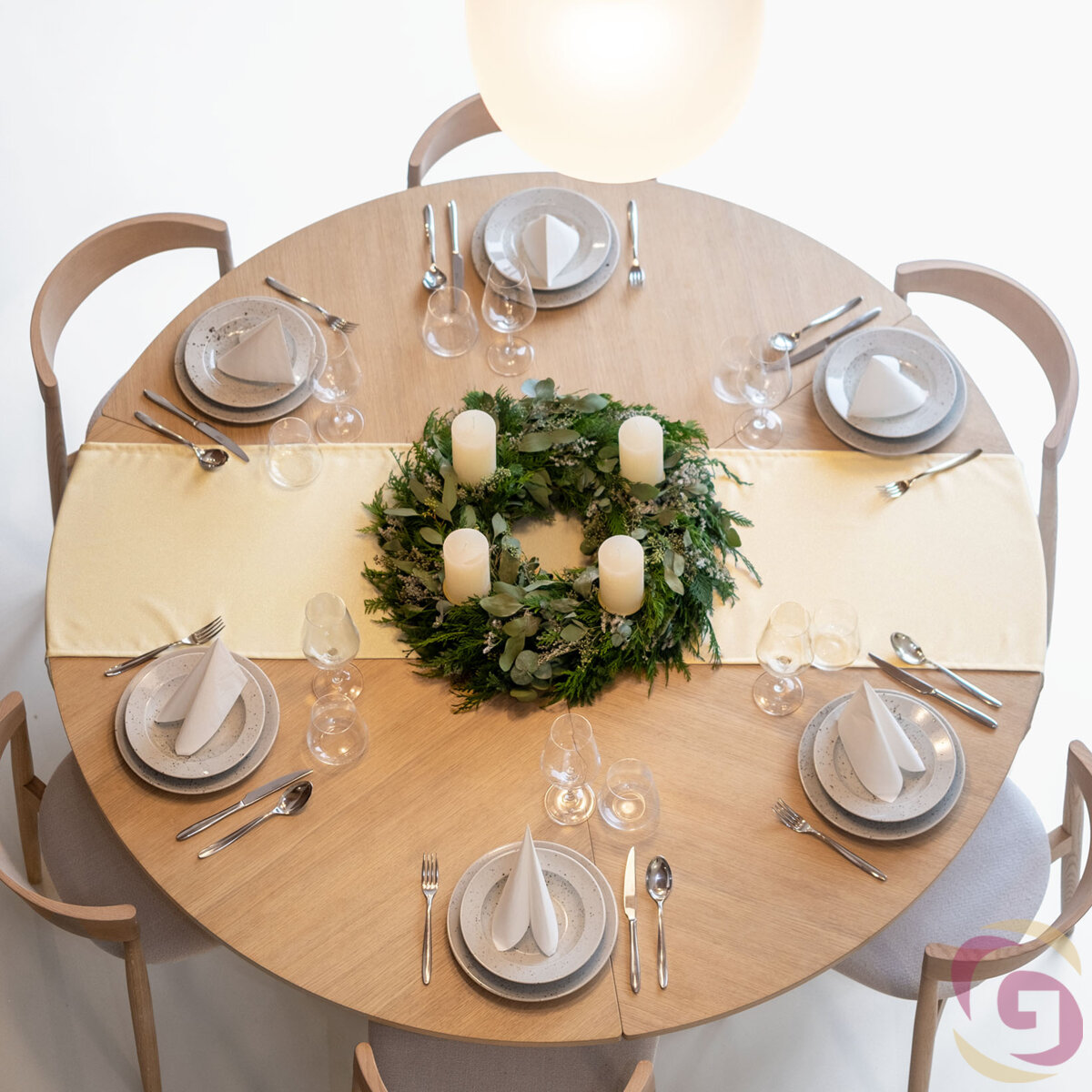 Der Tischläufer sollte nicht mehr als ein Drittel der Breite des Tisches in der Mitte einnehmen. Nur so setzt sie sich schön ab und wirkt nicht störend. Gleichzeitig sollte sie auf jeder Seite mindestens 15-20 cm über die Tischkante hinausragen. Es kommt aber immer darauf an, wo Sie die Tischläufer verwenden und welche Überlappung für Sie passt.