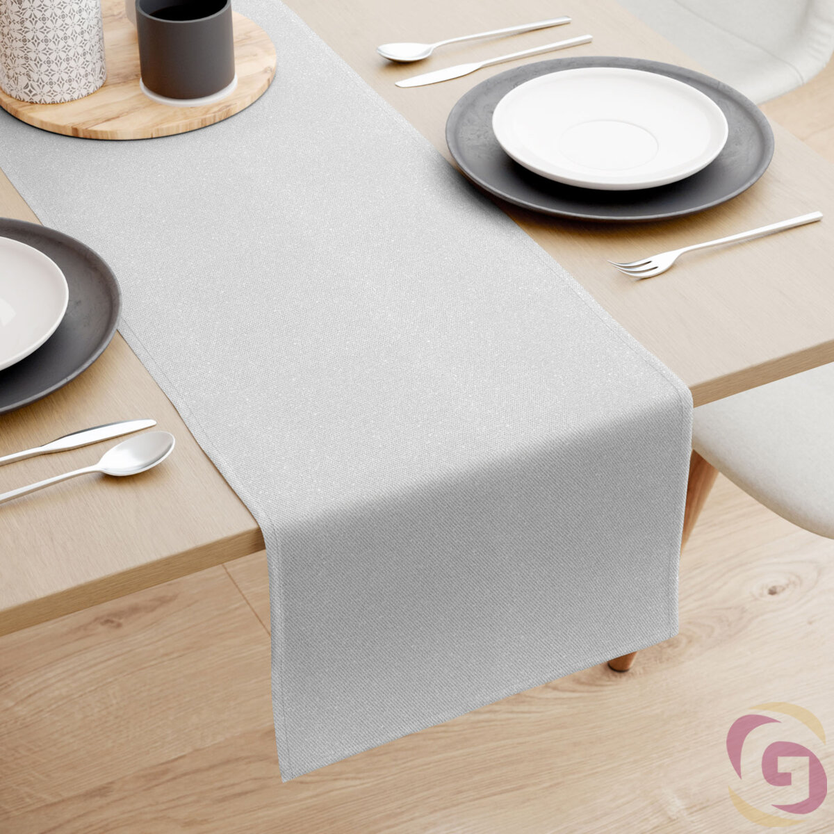 Silberner exklusiver Tischläufer mit Teflonbeschichtung aus hochwertigem 100% Polyesterstoff mit einem Flächengewicht von 205 g/m². Der Läufer ist rundum gesäumt. Er ist ein sehr praktisches und modernes Accessoire für den Ess- oder Konferenztisch.