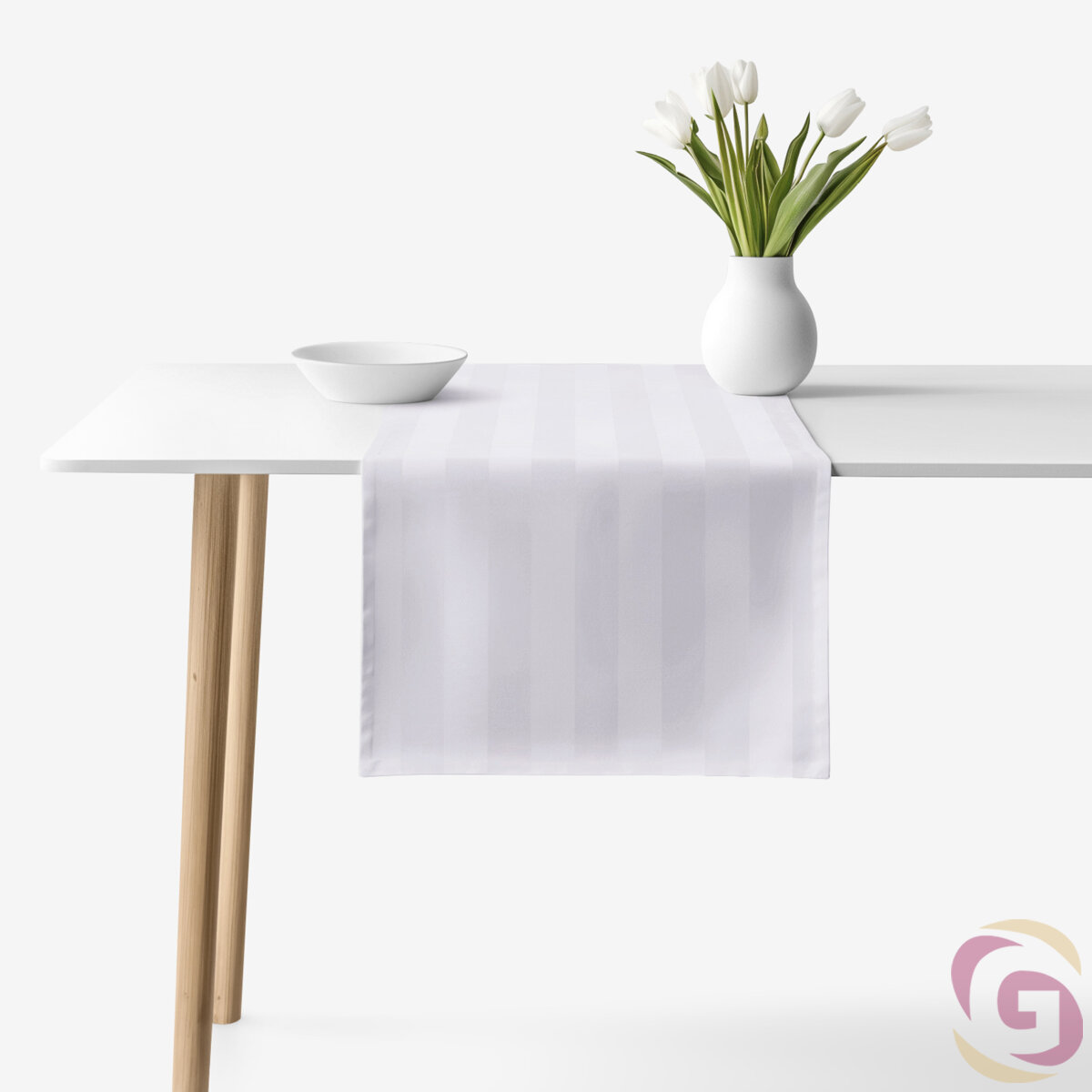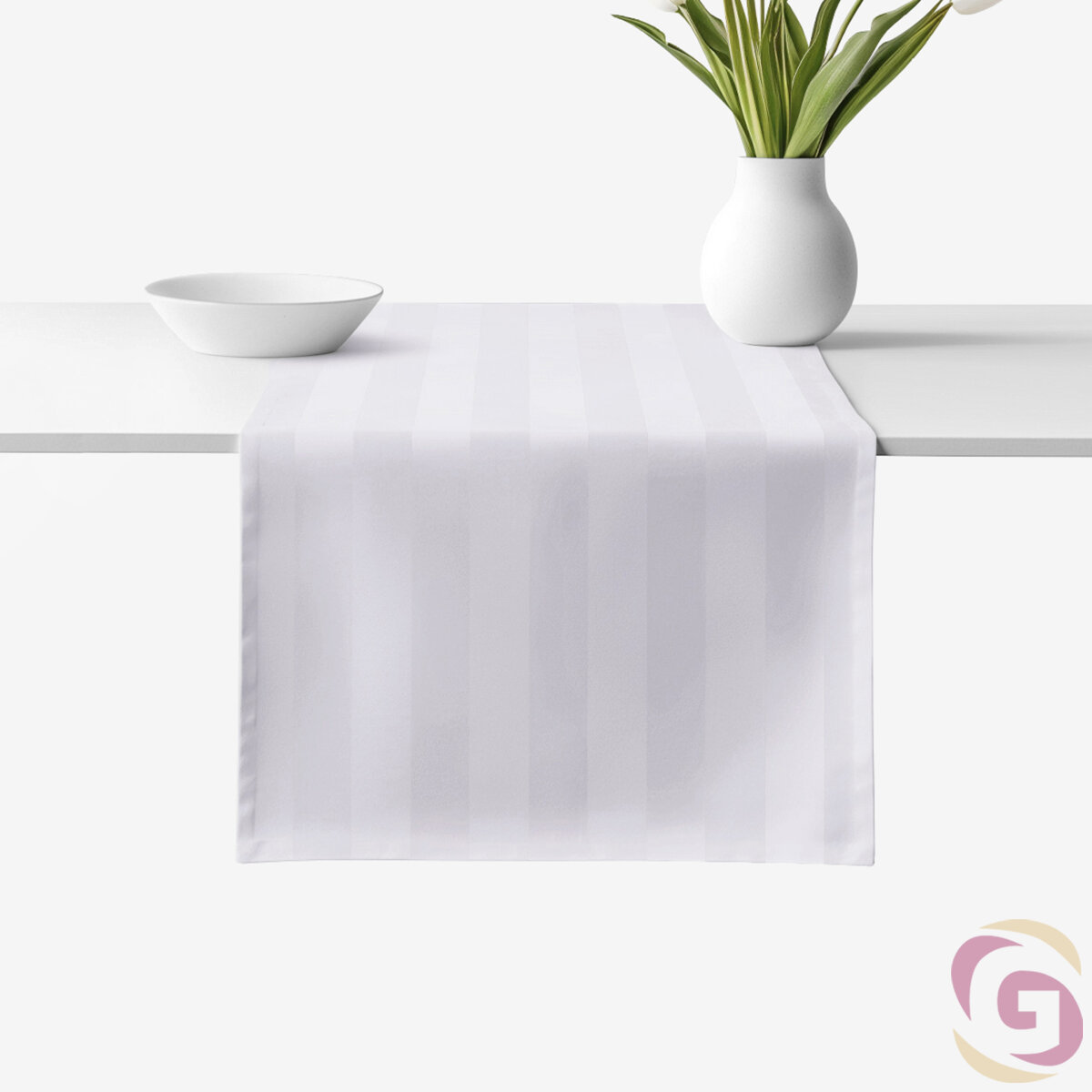 Der hellgraue Damast-Tischläufer passt perfekt zu festlichen und alltäglichen Mahlzeiten. Dezente 3 cm breite Streifen verleihen dem Läufer ein zeitloses und luxuriöses Aussehen. Verwöhnen Sie sich mit einer Qualität, die das Auge erfreut und jedes Sitzen am Tisch zu einem angenehmen Moment macht.