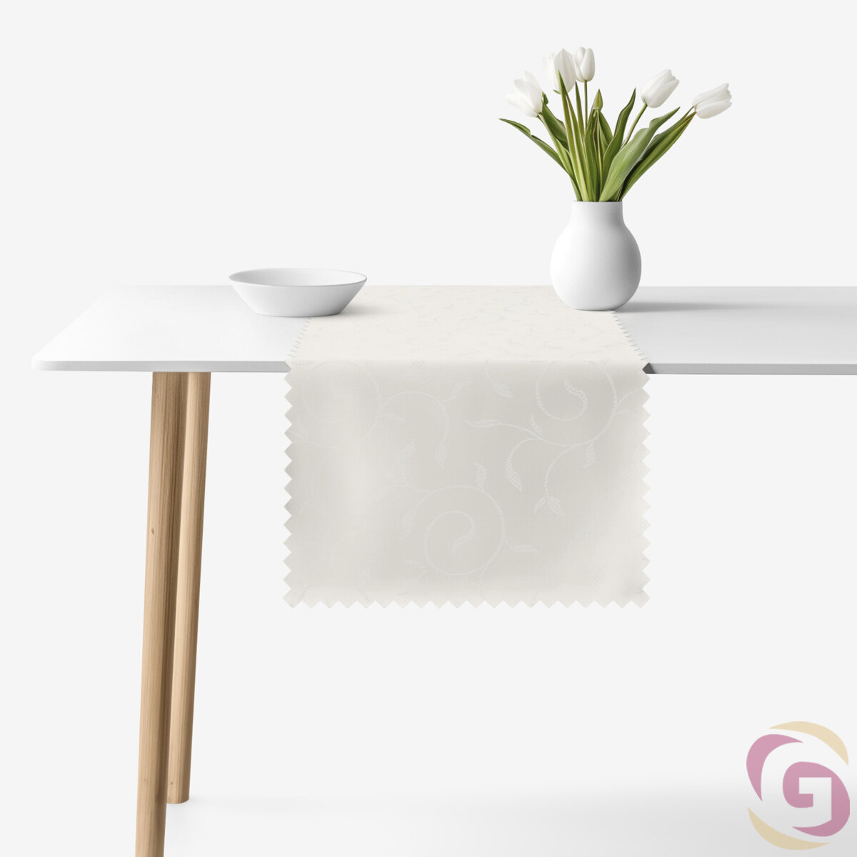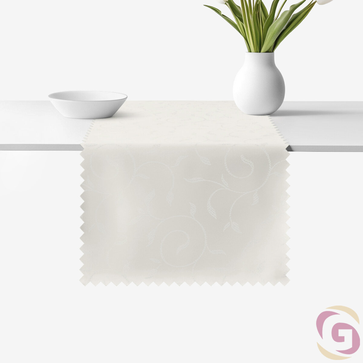 Eleganten Teflon-Tischläufer in creme besticht durch ein feines, modernes gewebtes Ornamentmuster, das der Tischdekoration eine raffinierte und festliche Note verleiht. Die glänzenden Details schaffen einen interessanten Kontrast zum matten Untergrund, wodurch ein dynamisches, zugleich unaufdringlich luxuriöses Erscheinungsbild entsteht, das sowohl für festliche als auch für den alltäglichen Gebrauch geeignet ist. Dieses Muster trägt zudem zur visuellen Belebung des Tisches bei, ohne aufdringlich zu wirken.