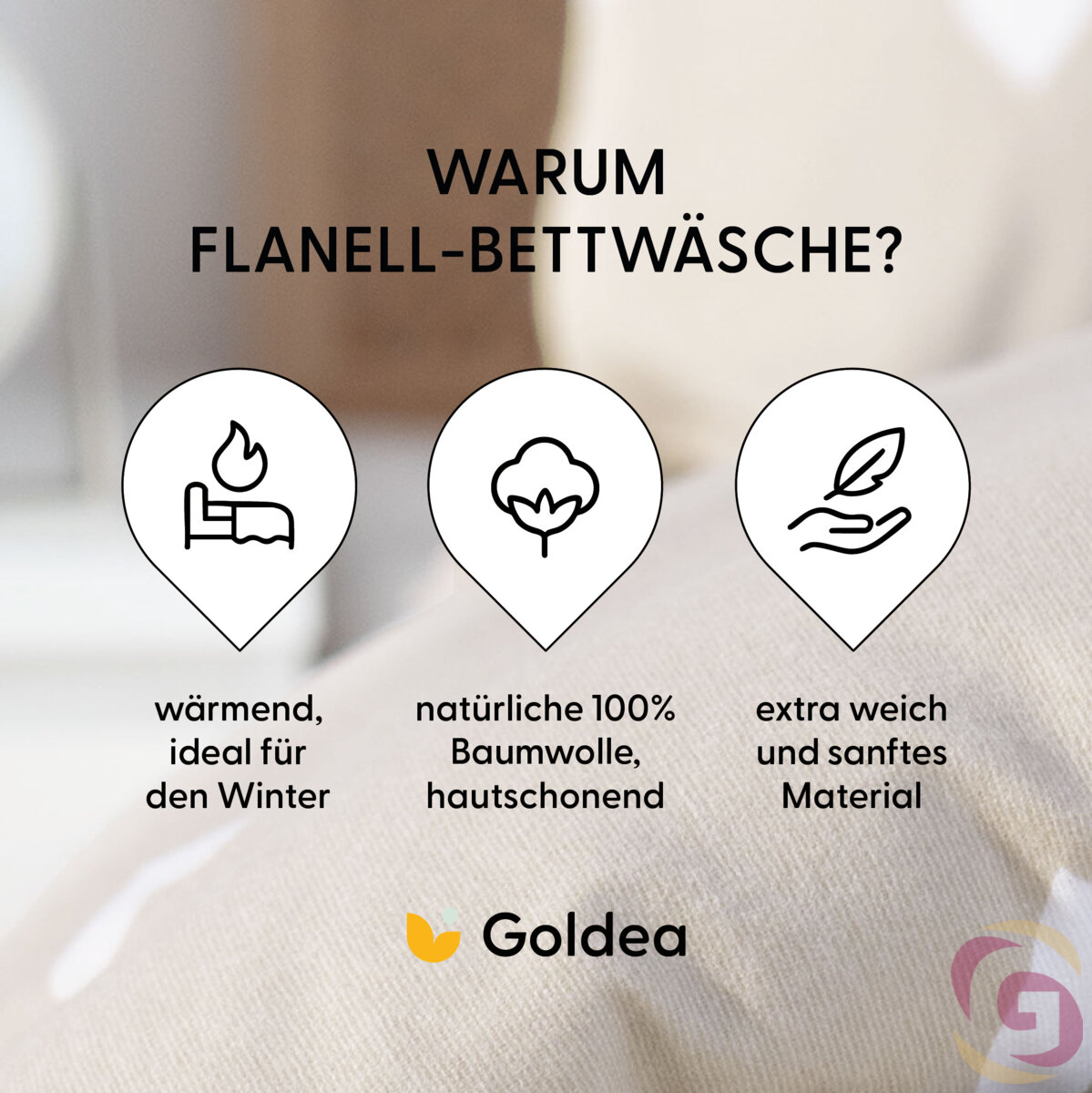 Die Bettwäsche ist aus 100% naturreiner Baumwolle (160 g/m²) gefertigt, die durch eine spezielle Veredelung, das sogenannte Kämmen, besonders wärmend wirkt. In Kombination mit dem höheren Flächengewicht sorgt die Flanell-Bettwäsche selbst an den kältesten Tagen für wohlige Wärme. Zudem ist Flanell sehr weich und angenehm im Griff.