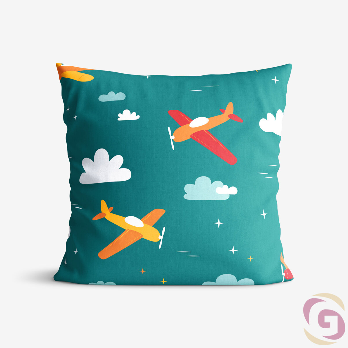Kissenbezug aus Baumwolle mit Motiv bunte Flugzeuge auf petrol Hintergrund (gleiches Motiv auf beiden Seiten). Der Kissenbezug ist aus hochwertiger und angenehmer 100% Baumwolle gefertigt. Er hat einen praktischen Reißverschluss.