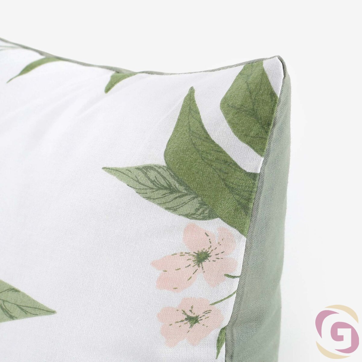 Der Bezug ist auf der einen Seite mit einem Motiv mit Duft von Jasmin und auf der anderen Seite mit einem unifarbenen salbeigrünen Motiv versehen. Schmücken Sie Ihr Zuhause mit diesem einzigartigen Bezug aus Baumwolle aus der Duo-Reihe.