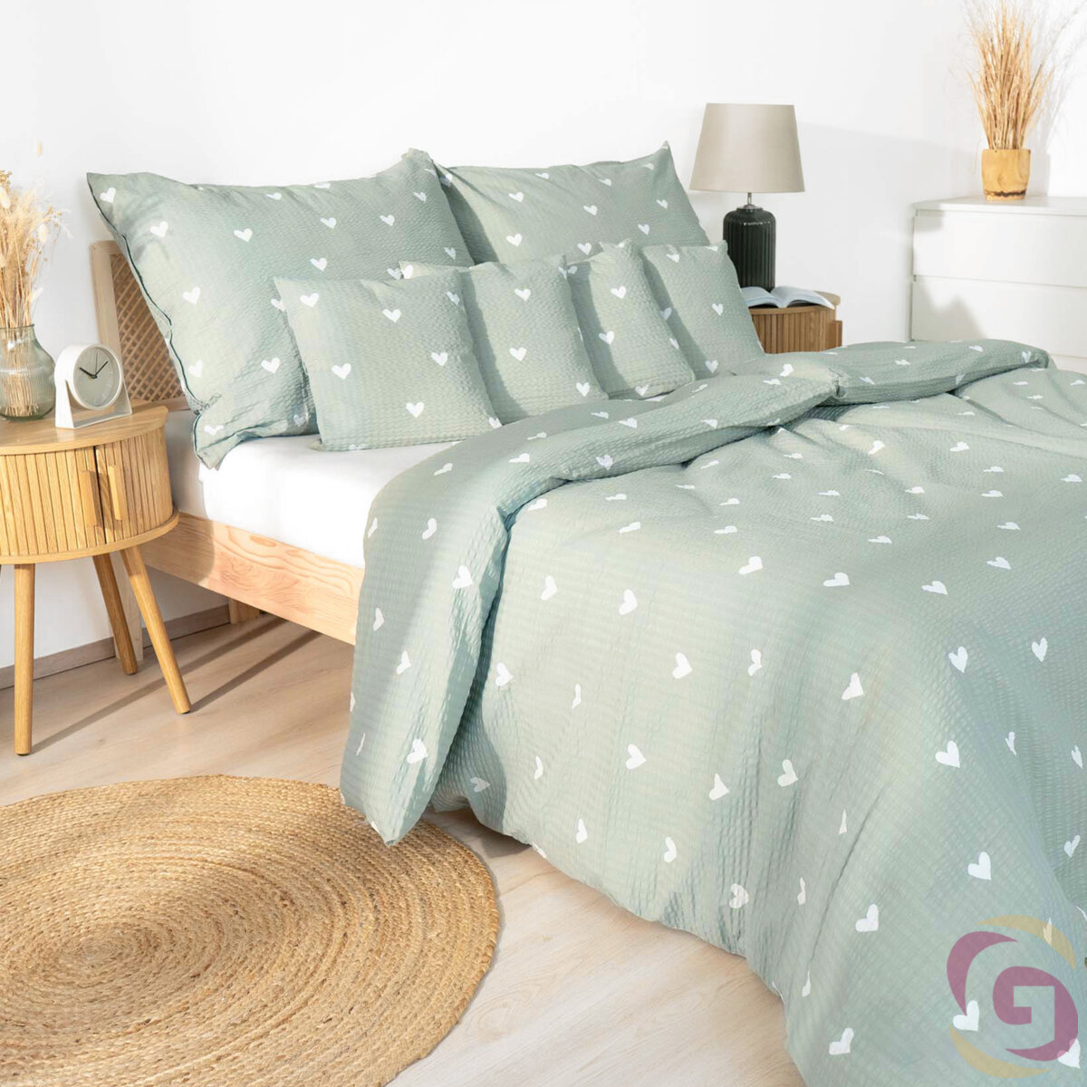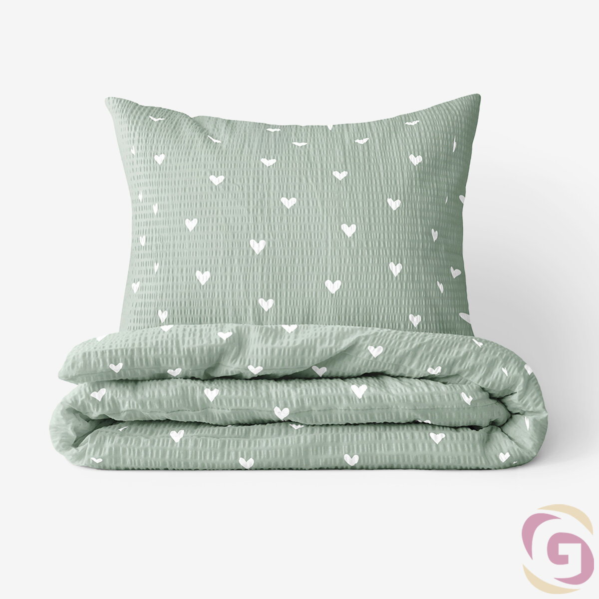 Seersucker Bettwäsche - Herzchen auf Salbeigrün