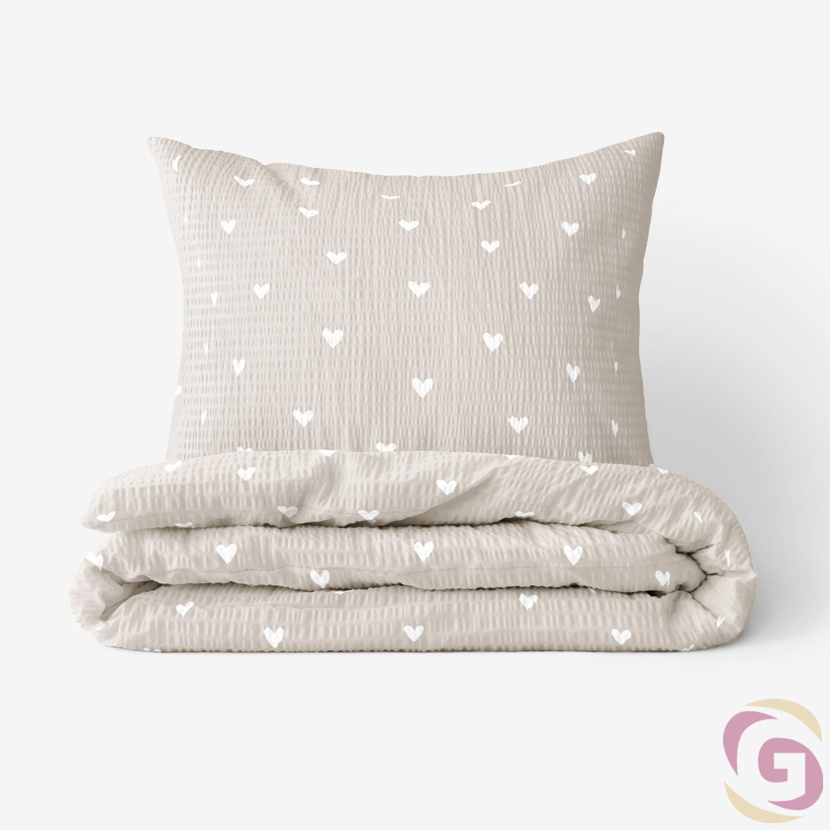 Seersucker Bettwäsche - weiße Herzchen auf latte