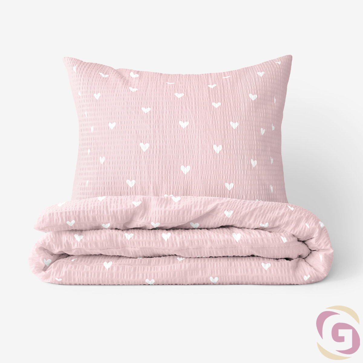 Seersucker Bettwäsche - weiße Herzchen auf Puderrosa
