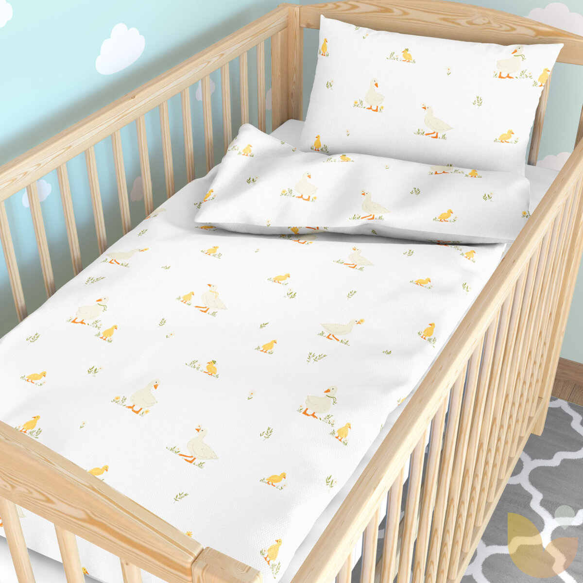 Die Bettwäsche für Babybetten mit einem zarten Entenmotiv zaubert ein Lächeln auf das Gesicht Ihrer Kinder. Der Grundstoff der Bettwäsche ist weiß. Sie ist aus hochwertiger und glatter 100%iger Baumwolle mit einem Gewicht von 145 g/m2 hergestellt.