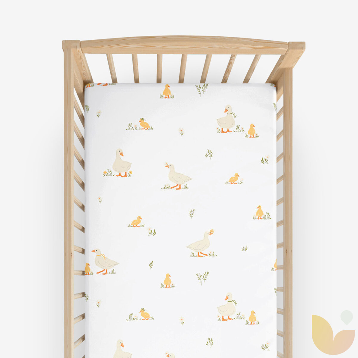 Baby-Baumwollbetttuch mit einem zarten Entenmotiv auf weißem Hintergrund. Es ist aus hochwertiger und glatter 100% Baumwolle mit einem Gewicht von 145 g/m2 hergestellt.