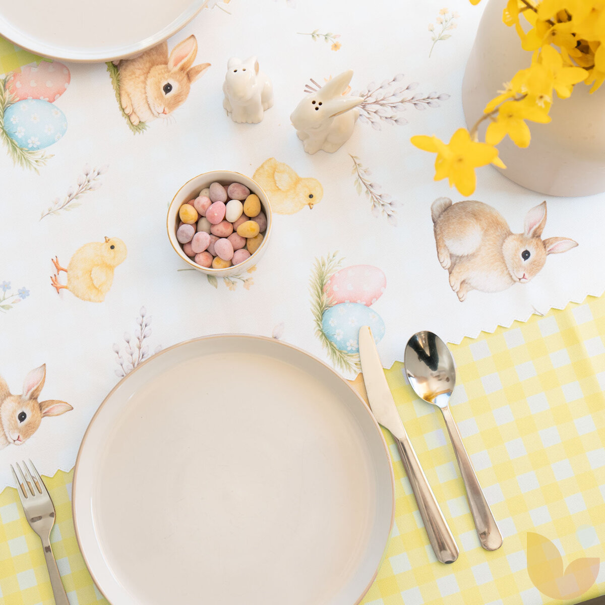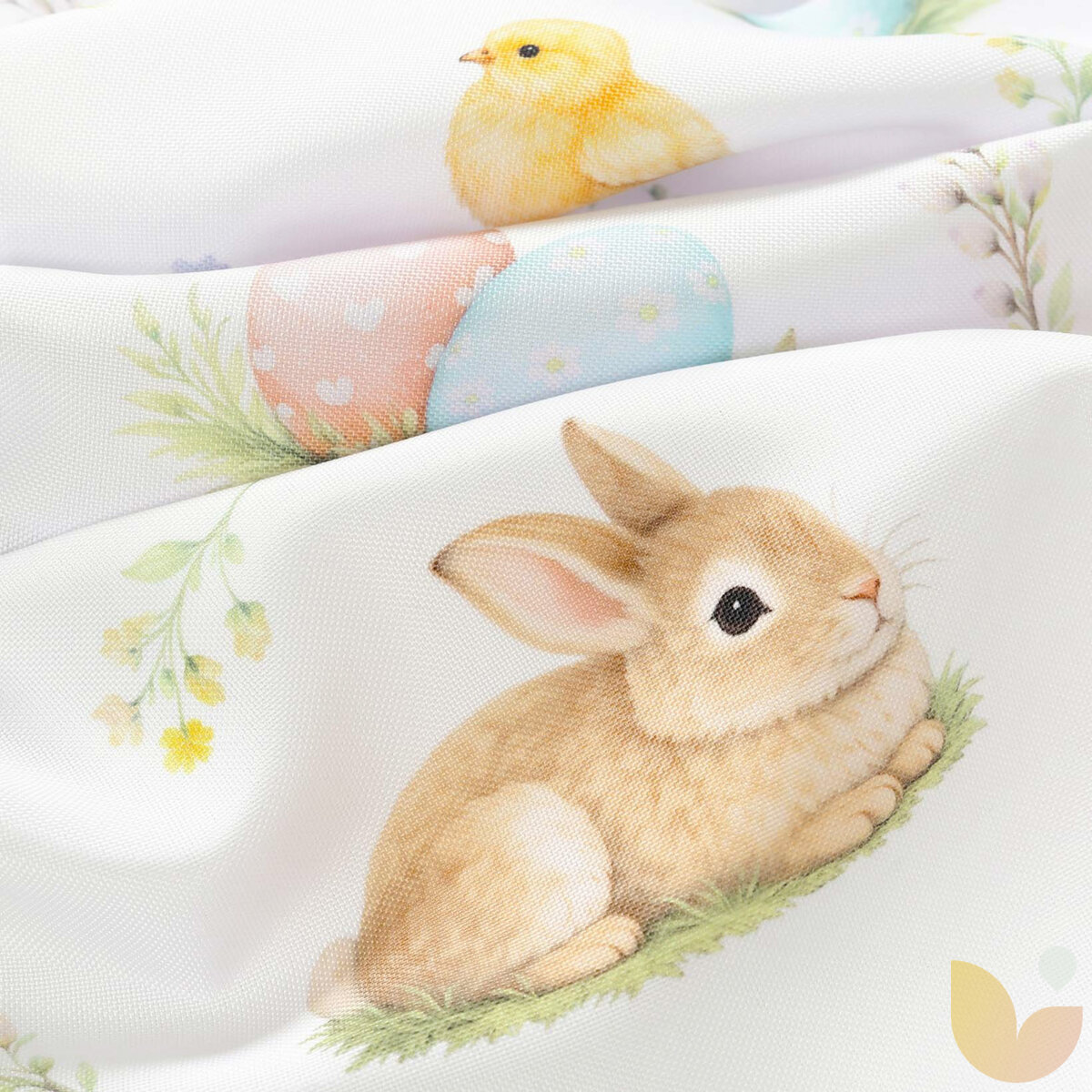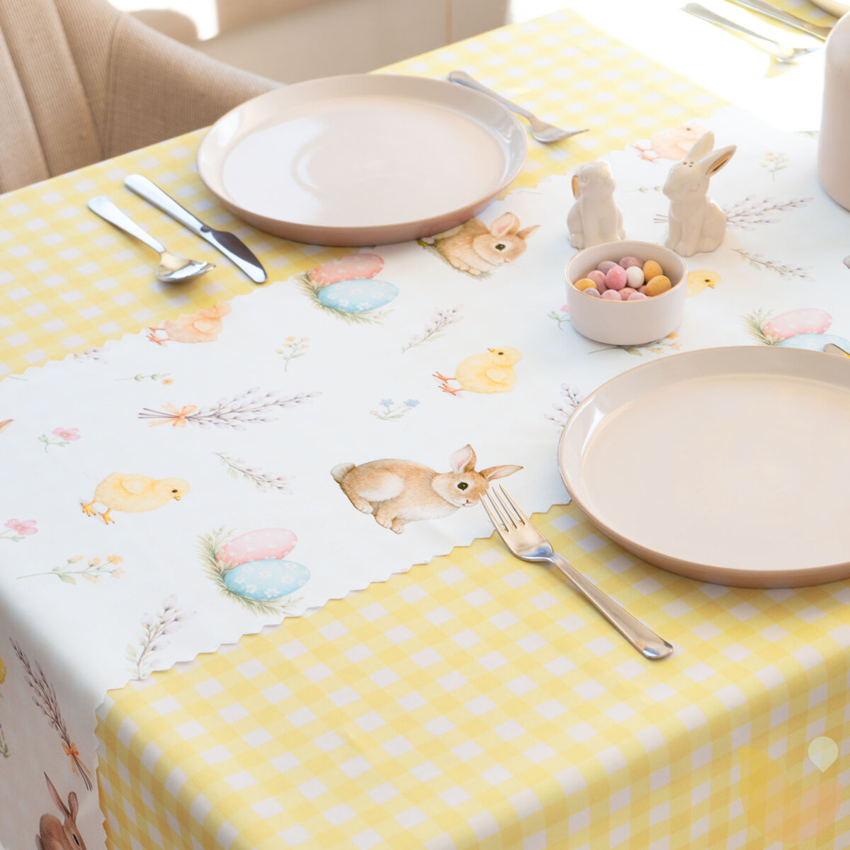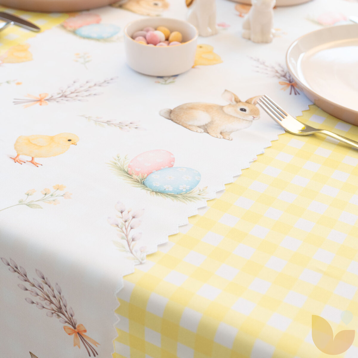Das Motiv traditioneller Ostersymbole bringt eine fröhliche festliche Atmosphäre und den Zauber des Frühlings in den Raum. Das Muster belebt den Tisch auf schöne Weise, lässt das Interieur erstrahlen und unterstreicht die Osterzeit voller Wohlbefinden, Traditionen und gemeinsam mit der Familie verbrachter Zeit.
