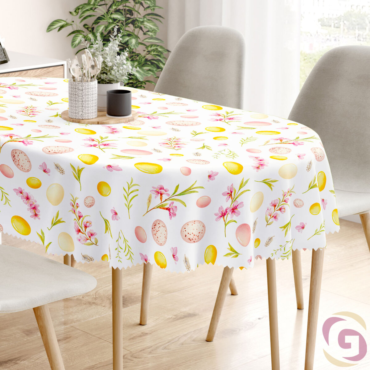 Teflon Ovale-Tischdecke mit Motiv Ostereier mit Blumen auf weißem Hintergrund. Sie ist aus dekorativem Stoff mit Teflon-Finish aus 100% Polyester (Gewicht 220g/m2) hergestellt. Die Tischdecke ist sehr formstabil und eignet sich für jeden ovalen Tisch. Dank der Teflon-Behandlung dringt verschüttete Flüssigkeit nicht in das Tischtuch ein. Die Tischdecke ist leicht abwaschbar. Verschmutzungen müssen nur mit einem feuchten Tuch abgewischt werden. Diese Tischdecke schmückt perfekt Ihr Interieur.