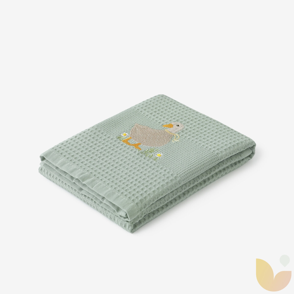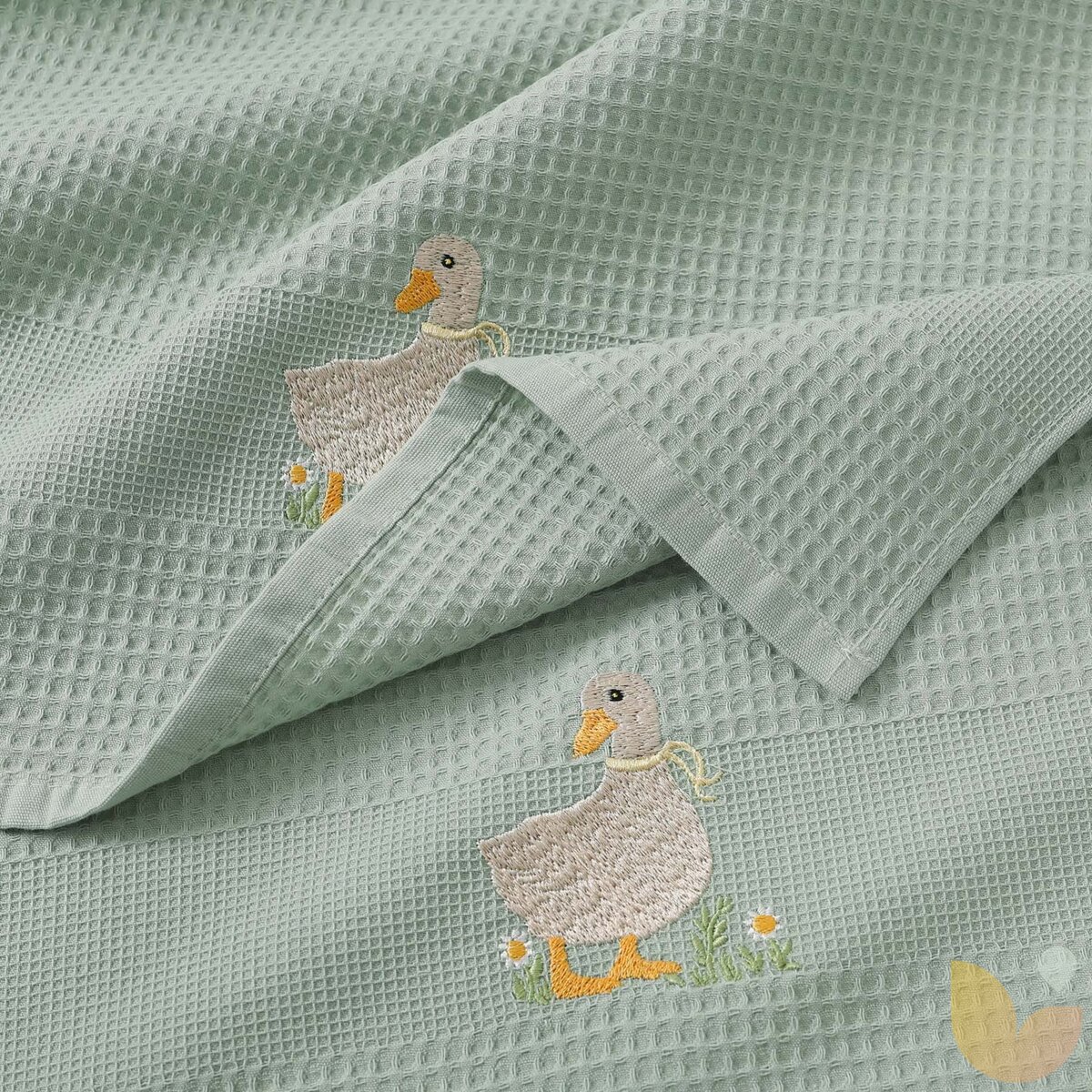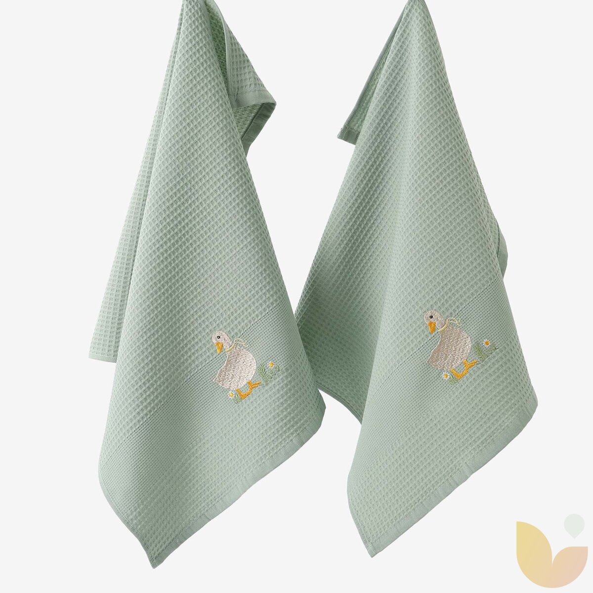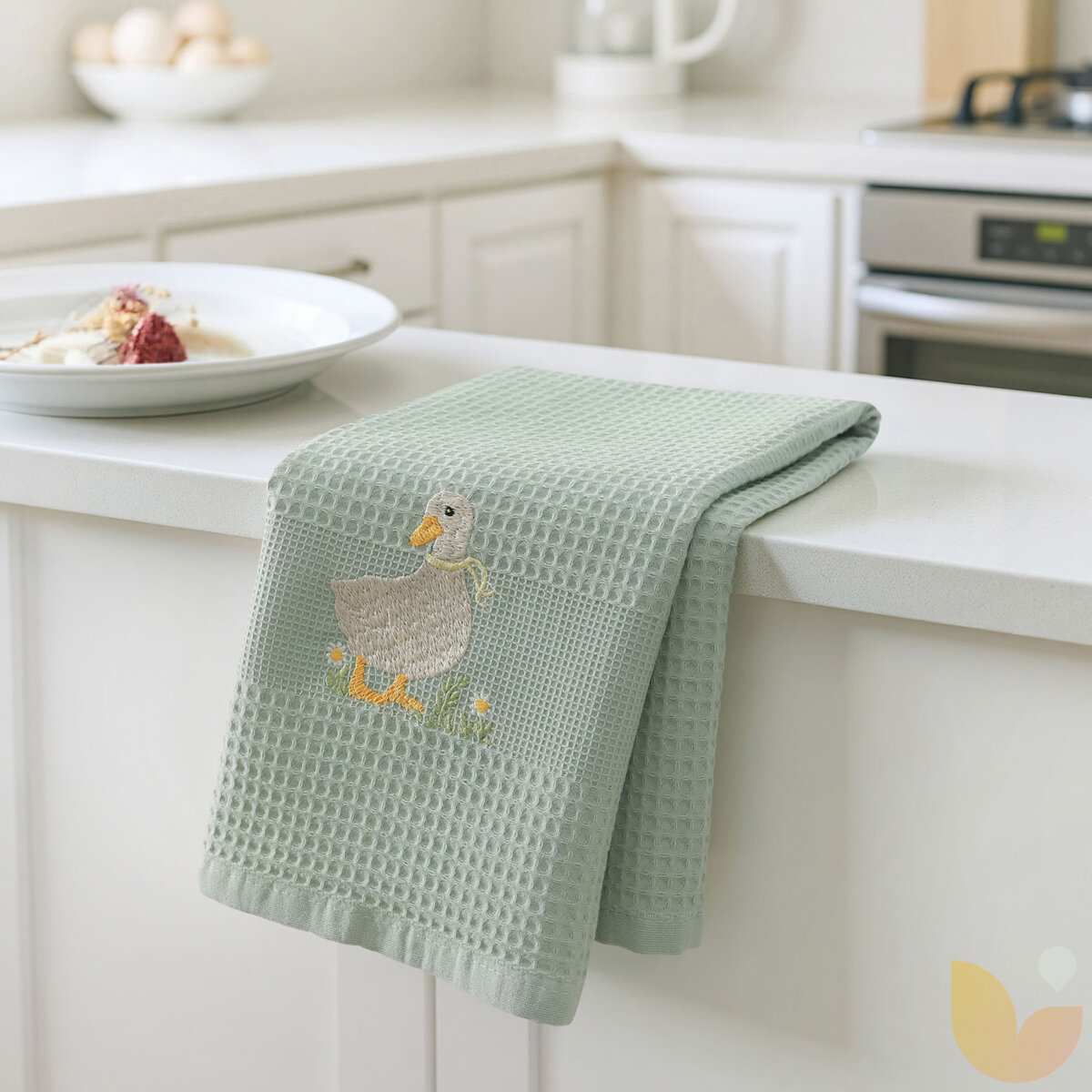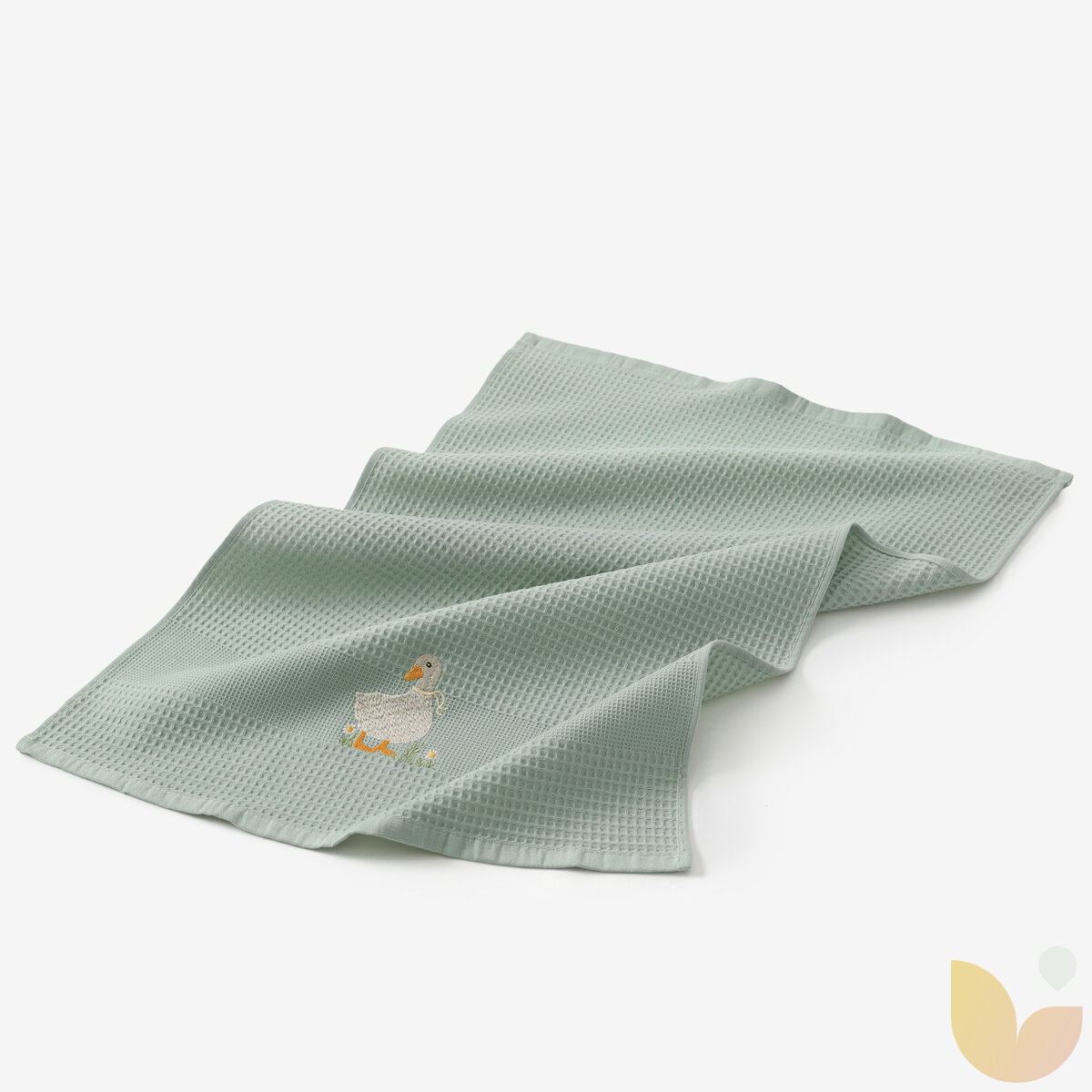 Ostern Waffel-Geschirrtuch mit Stickerei - Ente auf Salbeigrün