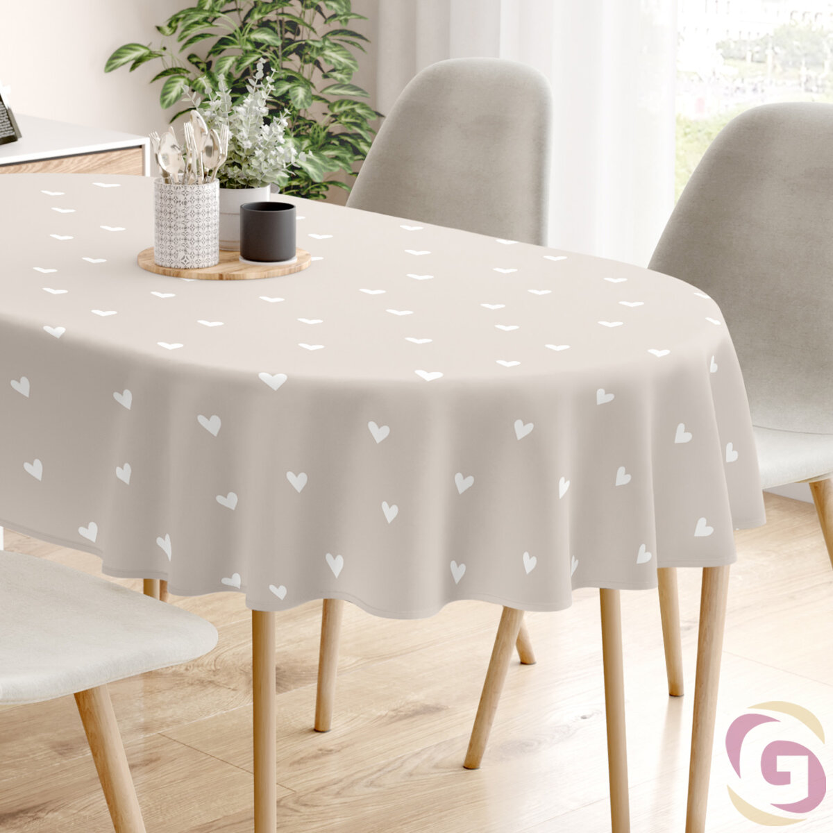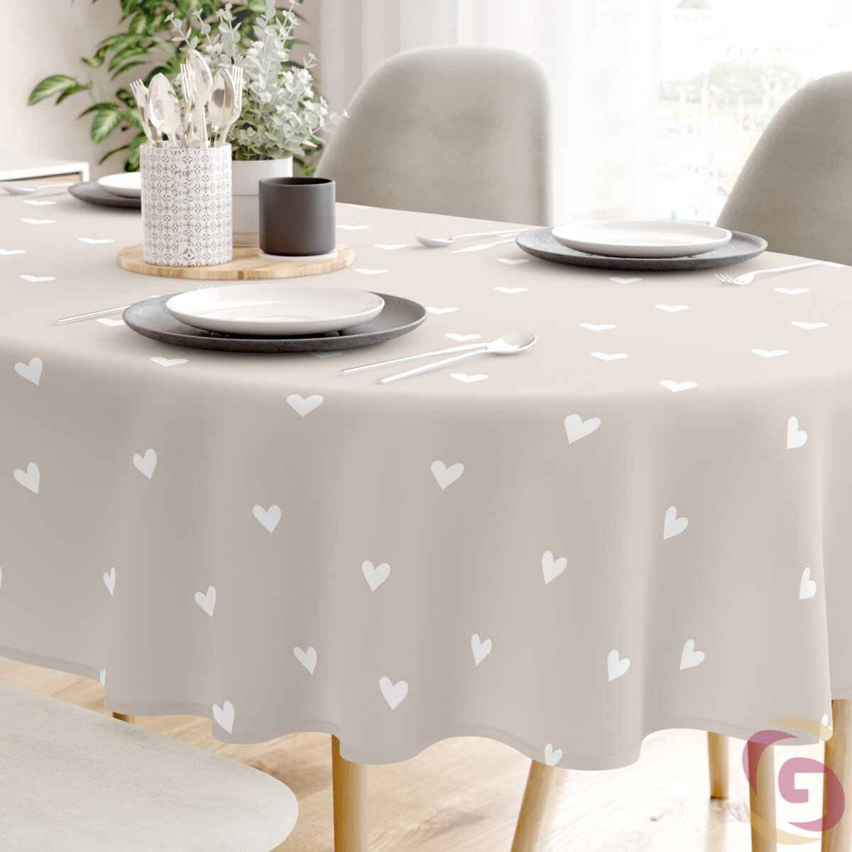 Ovale Tischdecke aus 100% Baumwolle - Herzchen auf Latte