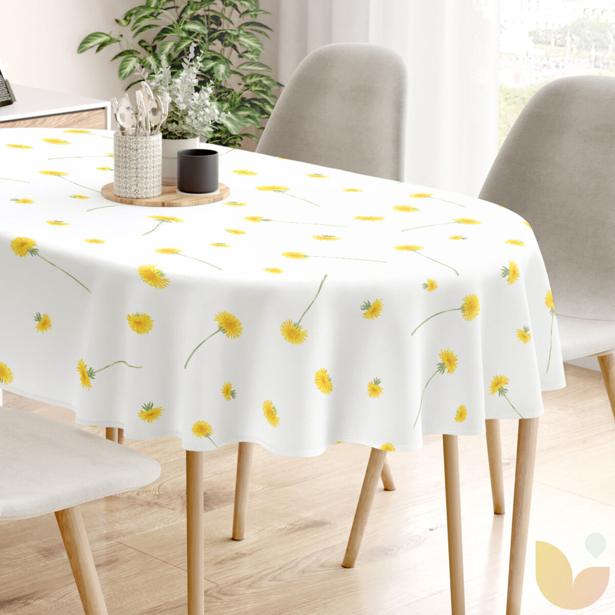 Die ovale Tischdecke aus Baumwolle mit Motiv von Löwenzahn auf weißem Hintergrund. Sie ist aus hochwertiger 100%iger Baumwolle (Gewicht 145g/m2) hergestellt. Die Tischdecke ist sehr formstabil und passt auf jeden ovalen Tisch. Diese Tischdecke schmückt perfekt Ihr Interieur.