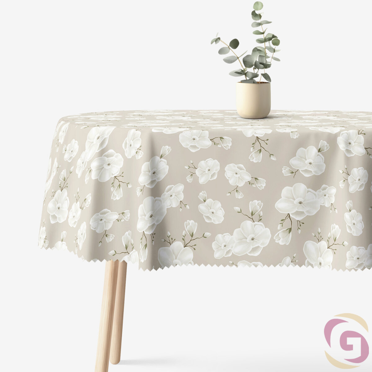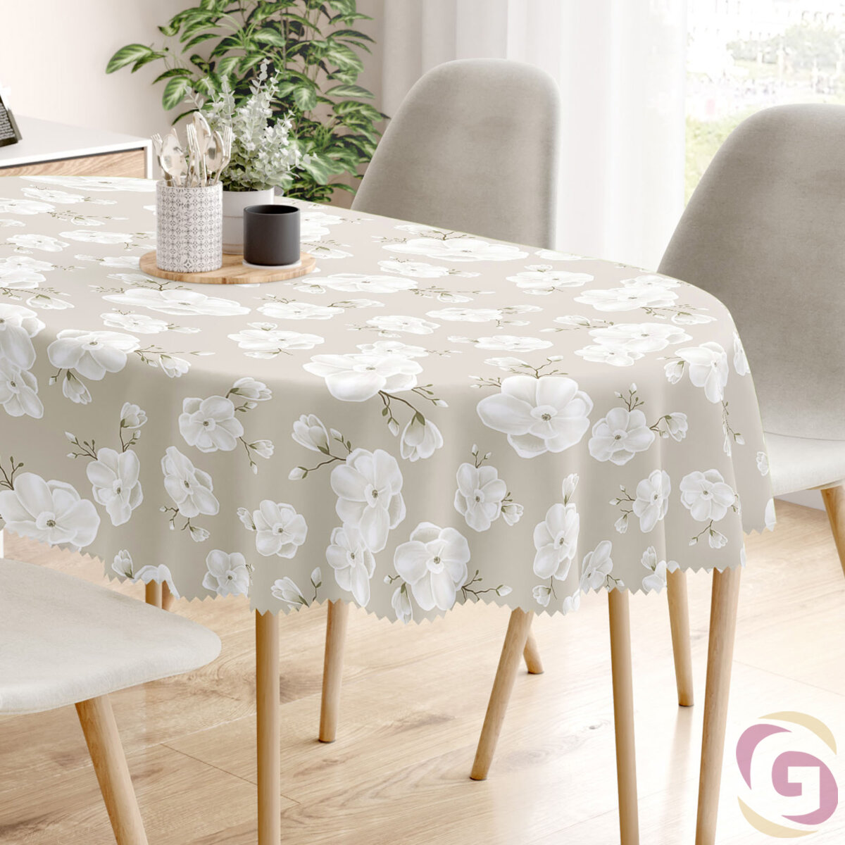Teflon Ovale-Tischdecke mit Motiv weiße Blumen auf graubraunem Hintergrund. Sie ist aus dekorativem Stoff mit Teflon-Finish aus 100% Polyester (Gewicht 220g/m2) hergestellt. Die Tischdecke ist sehr formstabil und eignet sich für jeden ovalen Tisch. Dank der Teflon-Behandlung dringt verschüttete Flüssigkeit nicht in das Tischtuch ein. Die Tischdecke ist leicht abwaschbar. Verschmutzungen müssen nur mit einem feuchten Tuch abgewischt werden. Diese Tischdecke schmückt perfekt Ihr Interieur.