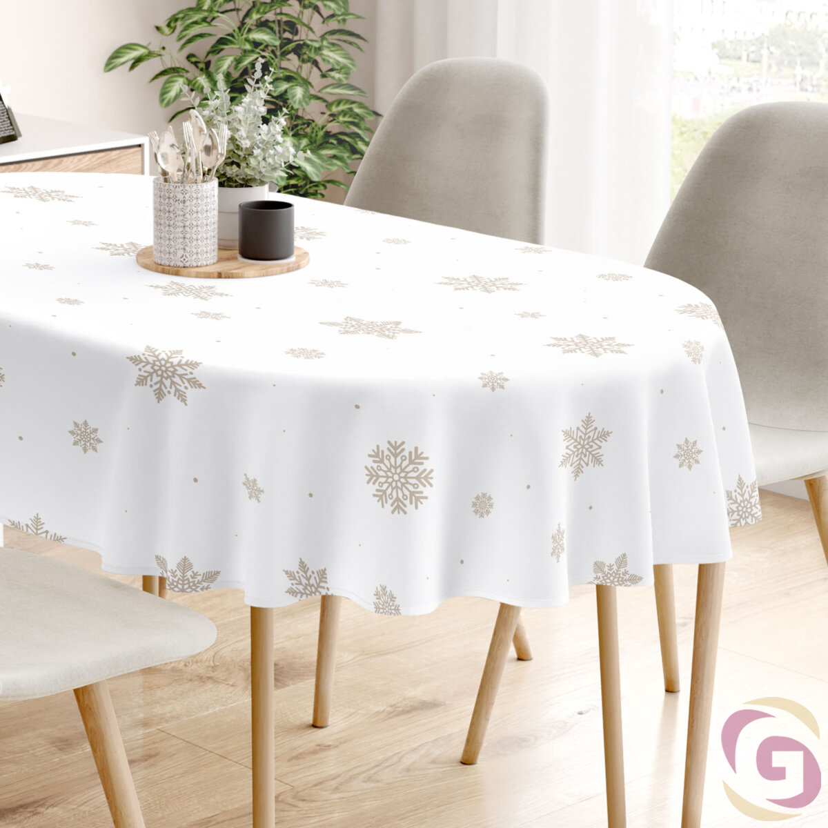 Ovale Weihnachts-Tischdecke aus 100% Baumwolle - Schneeflocken auf Weiß