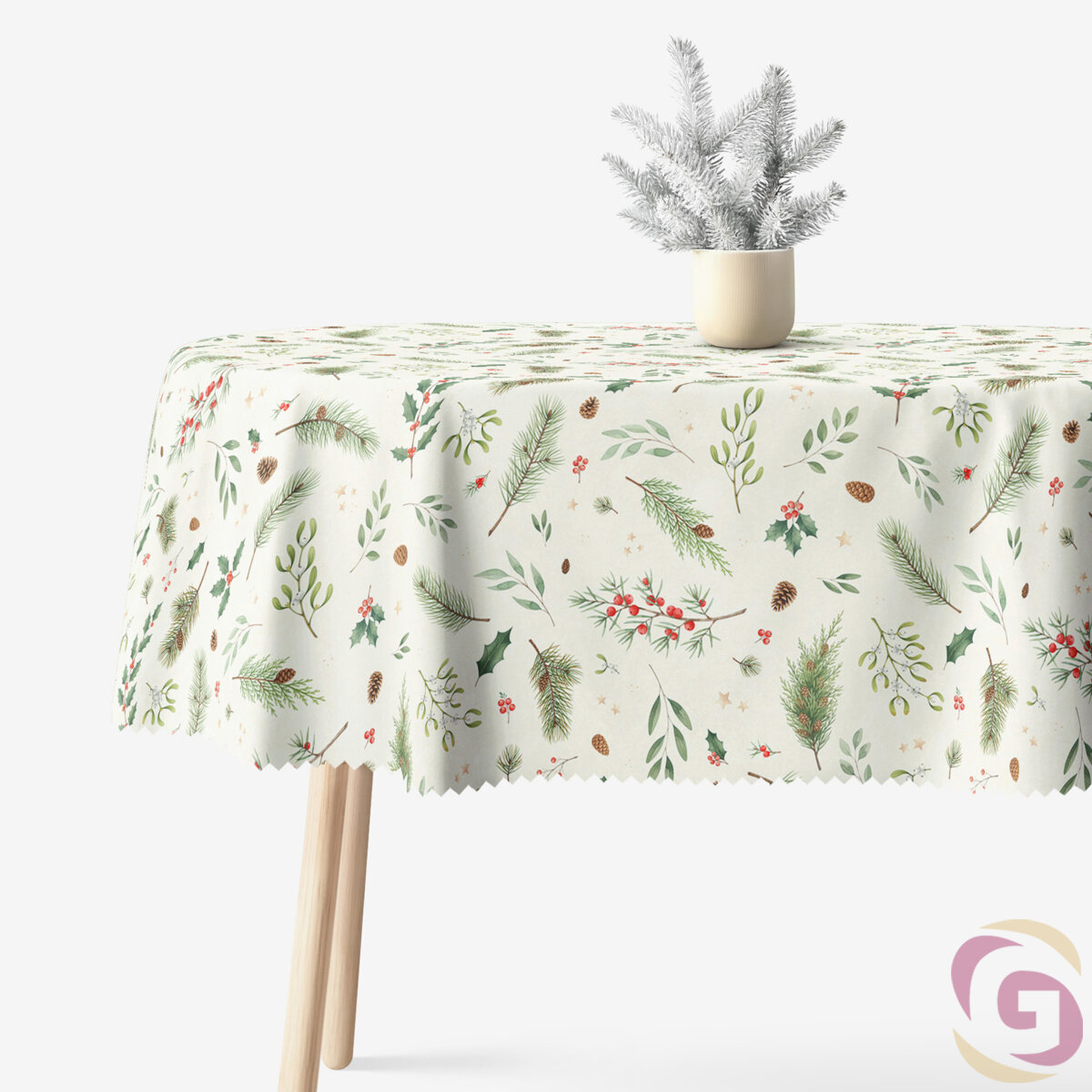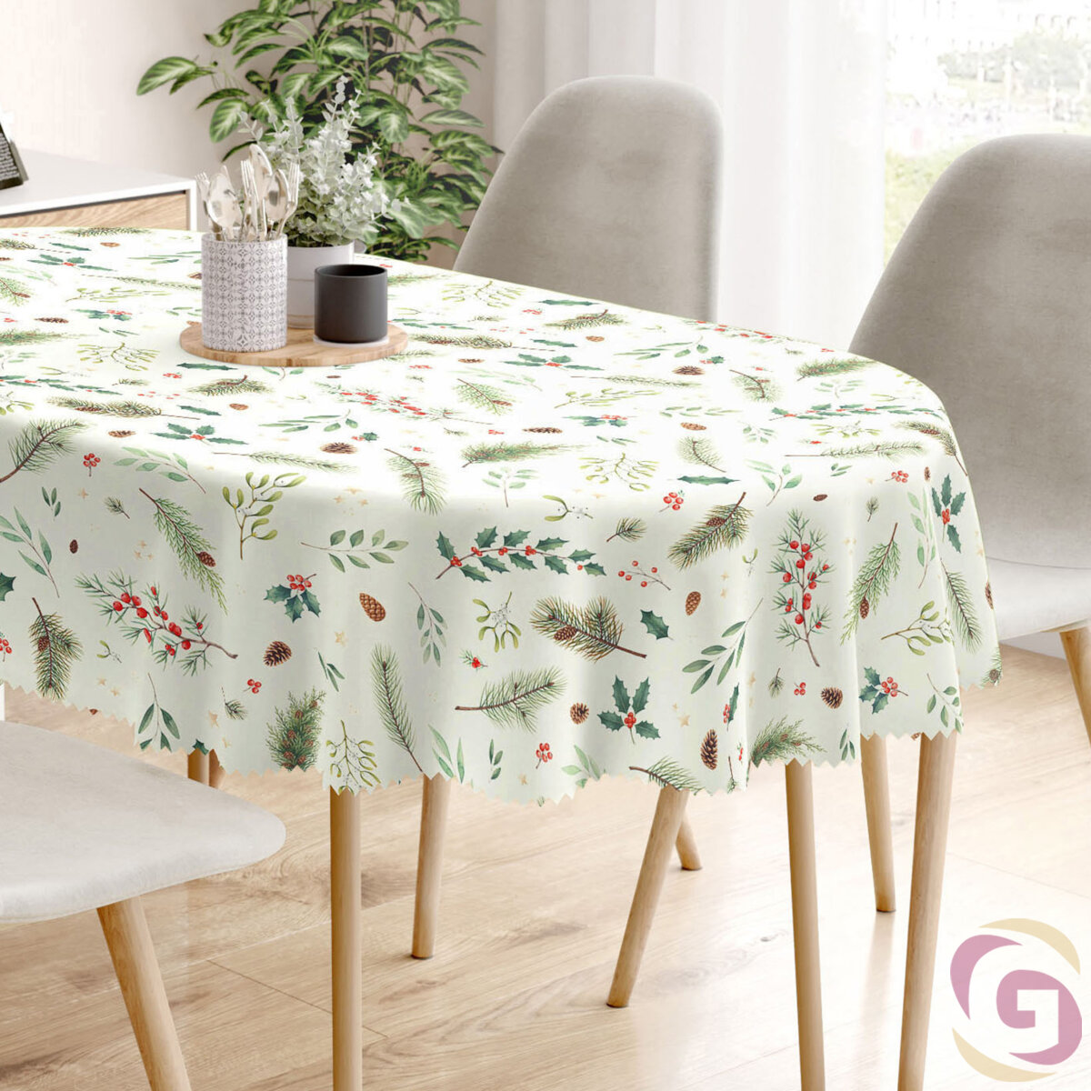 Das Tischdecke ist mit einem feinen Weihnachtsmuster verziert, das grüne Zweige, Stechpalmenbeeren, Kiefernzapfen und Mistelzweige kombiniert, ergänzt durch goldene Sternchen. Dieses natürliche Motiv vermittelt eine ruhige und festliche Atmosphäre der Winterfeiertage. Die Kombination der natürlichen Farbtöne Grün, Braun und Gold schafft eine gemütliche und elegante Dekoration, ideal für die Weihnachtszeit.