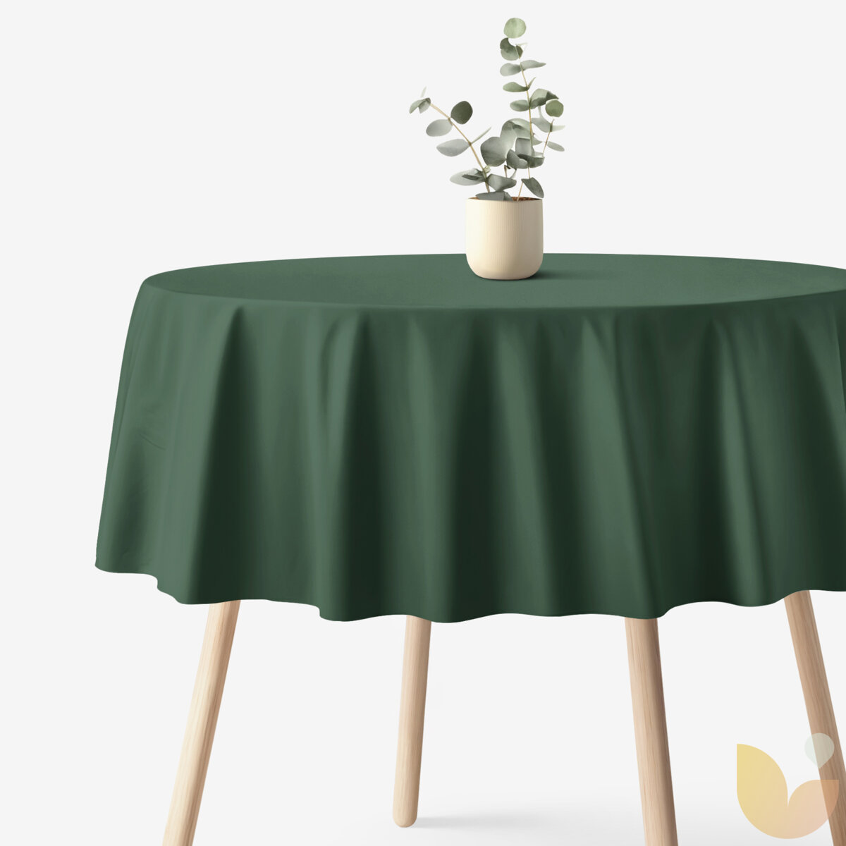Die runde Tischdecke aus 100 % Baumwollstoff in Farbe dunkelgrün mit einem Gewicht von 145 g/m2. Die Tischdecke ist rundum gesäumt.