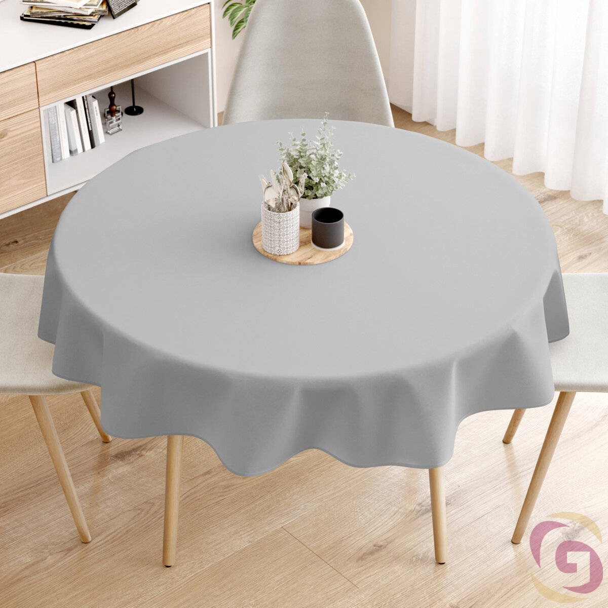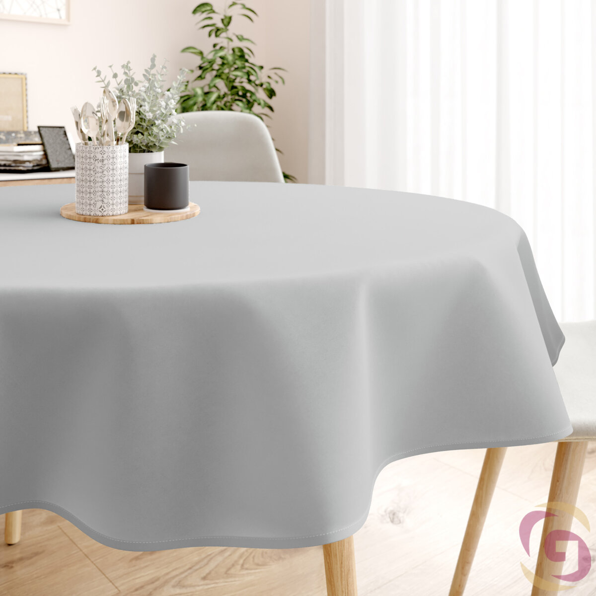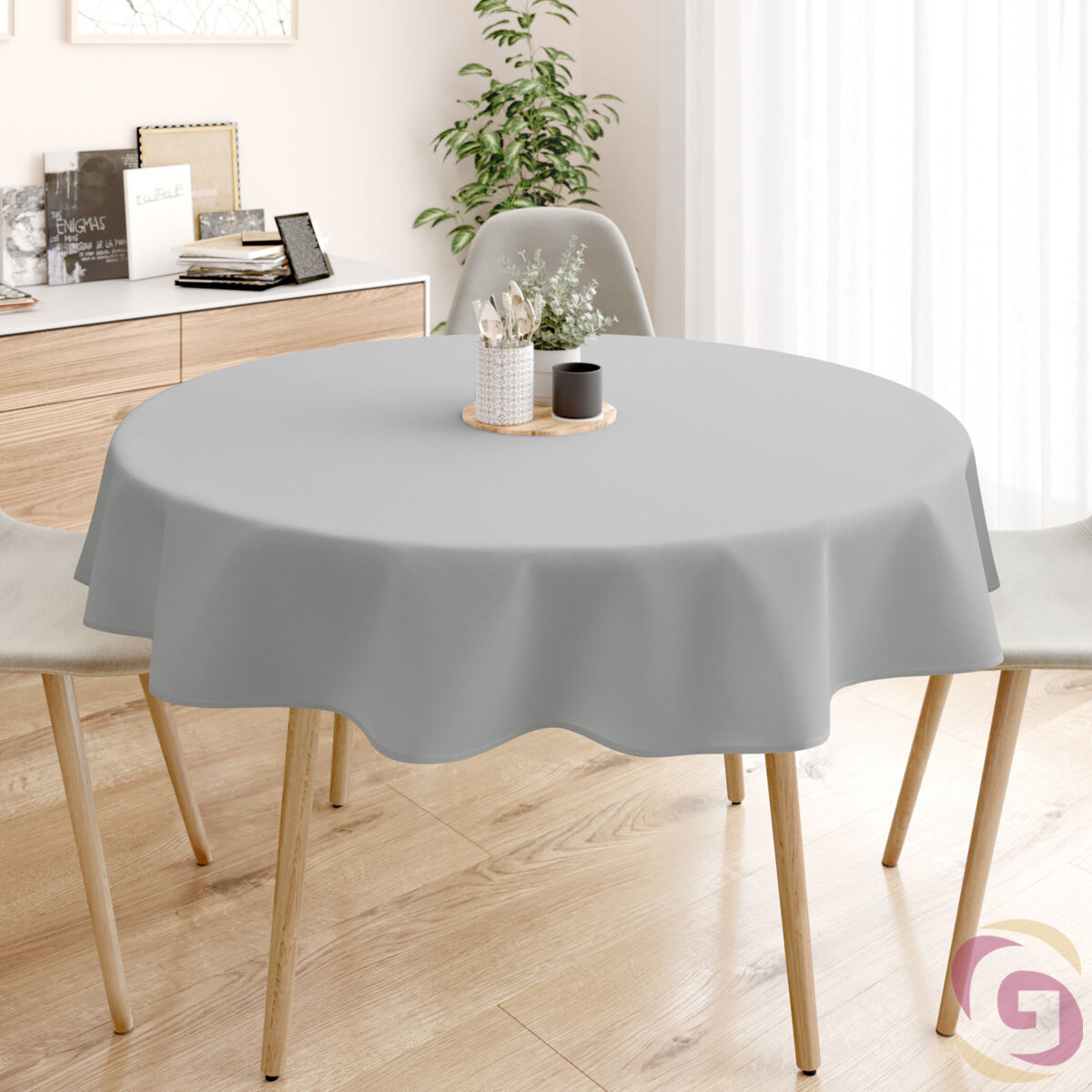 Die runde Tischdecke aus 100 % Baumwollstoff in Farbe grau mit einem Gewicht von 145 g/m2. Die Tischdecke ist rundum gesäumt.