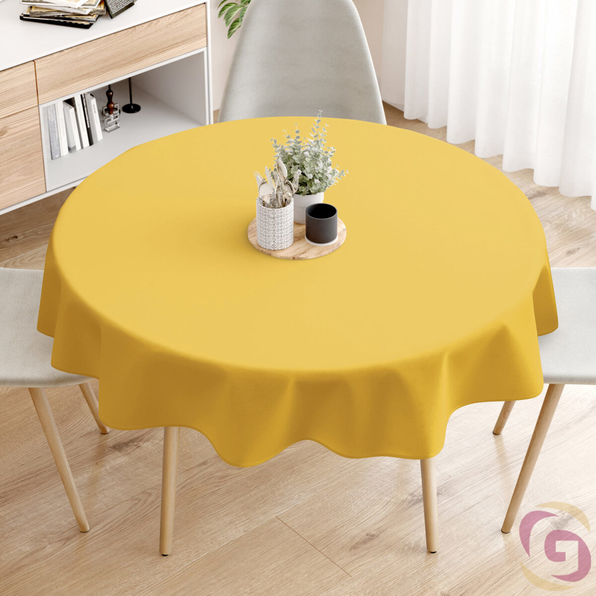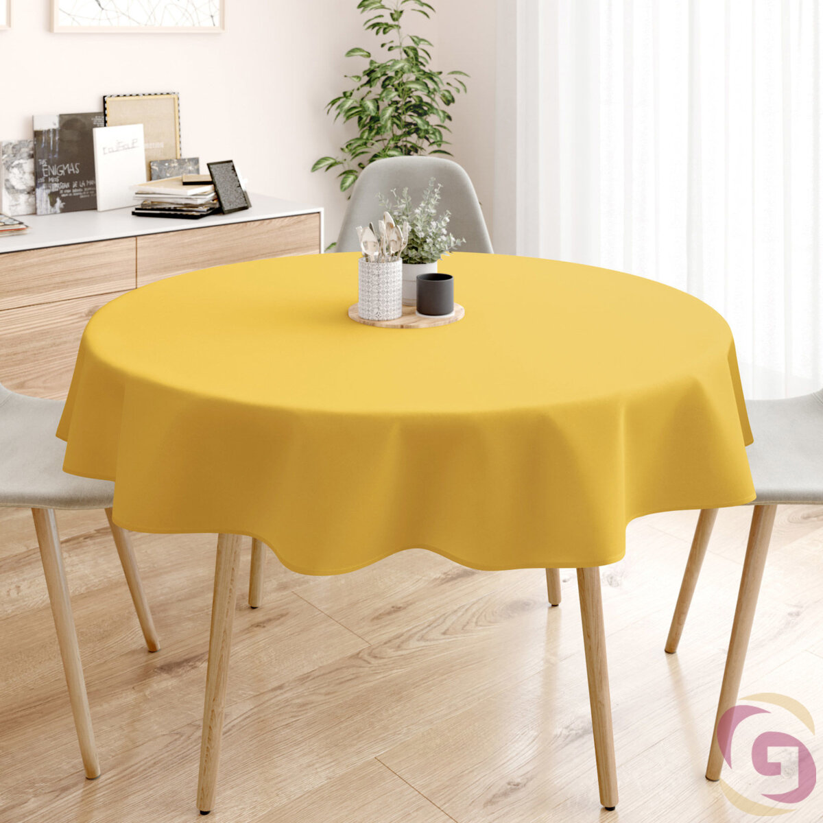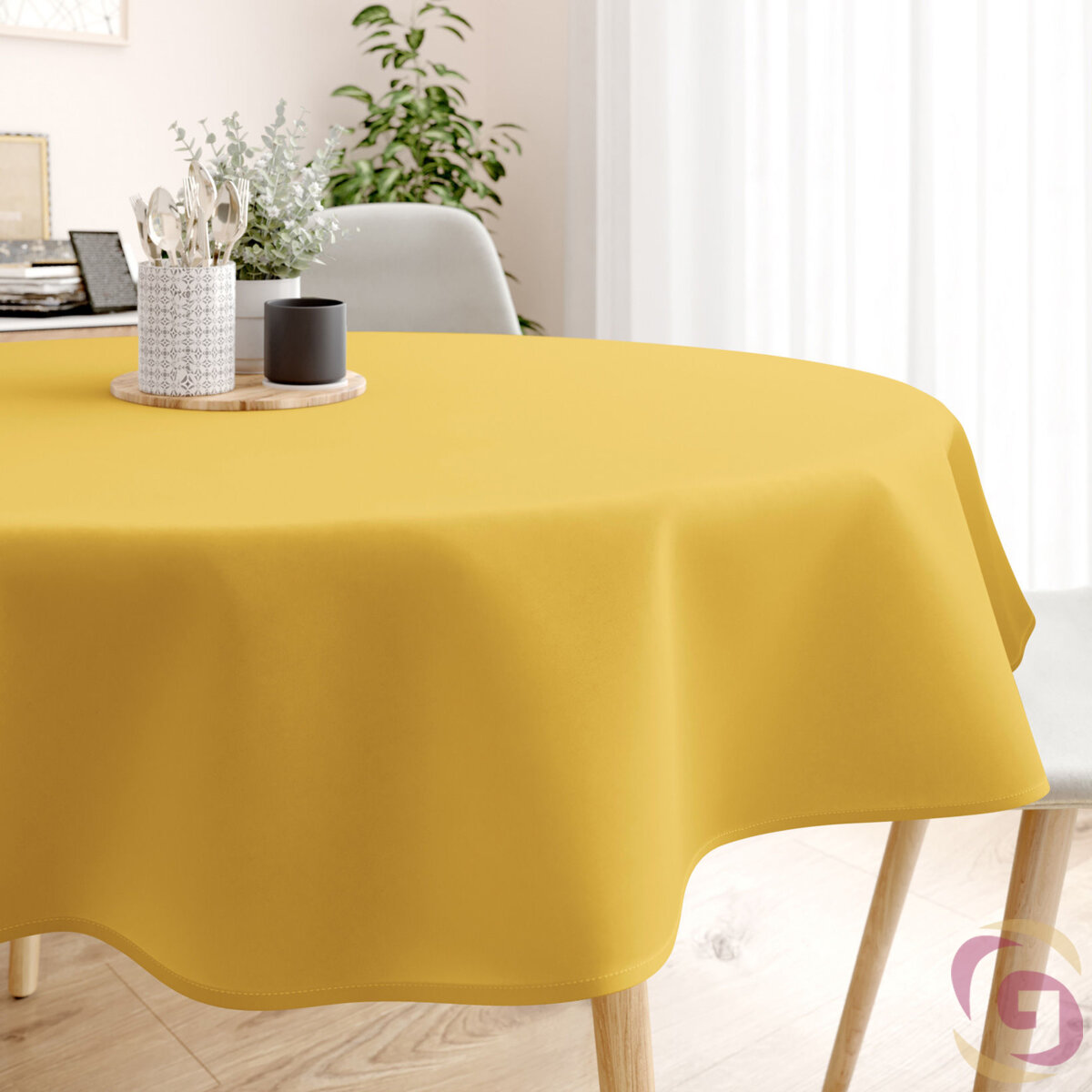 Die runde Tischdecke aus 100 % Baumwollstoff in Farbe honiggelb mit einem Gewicht von 145 g/m2. Die Tischdecke ist rundum gesäumt.