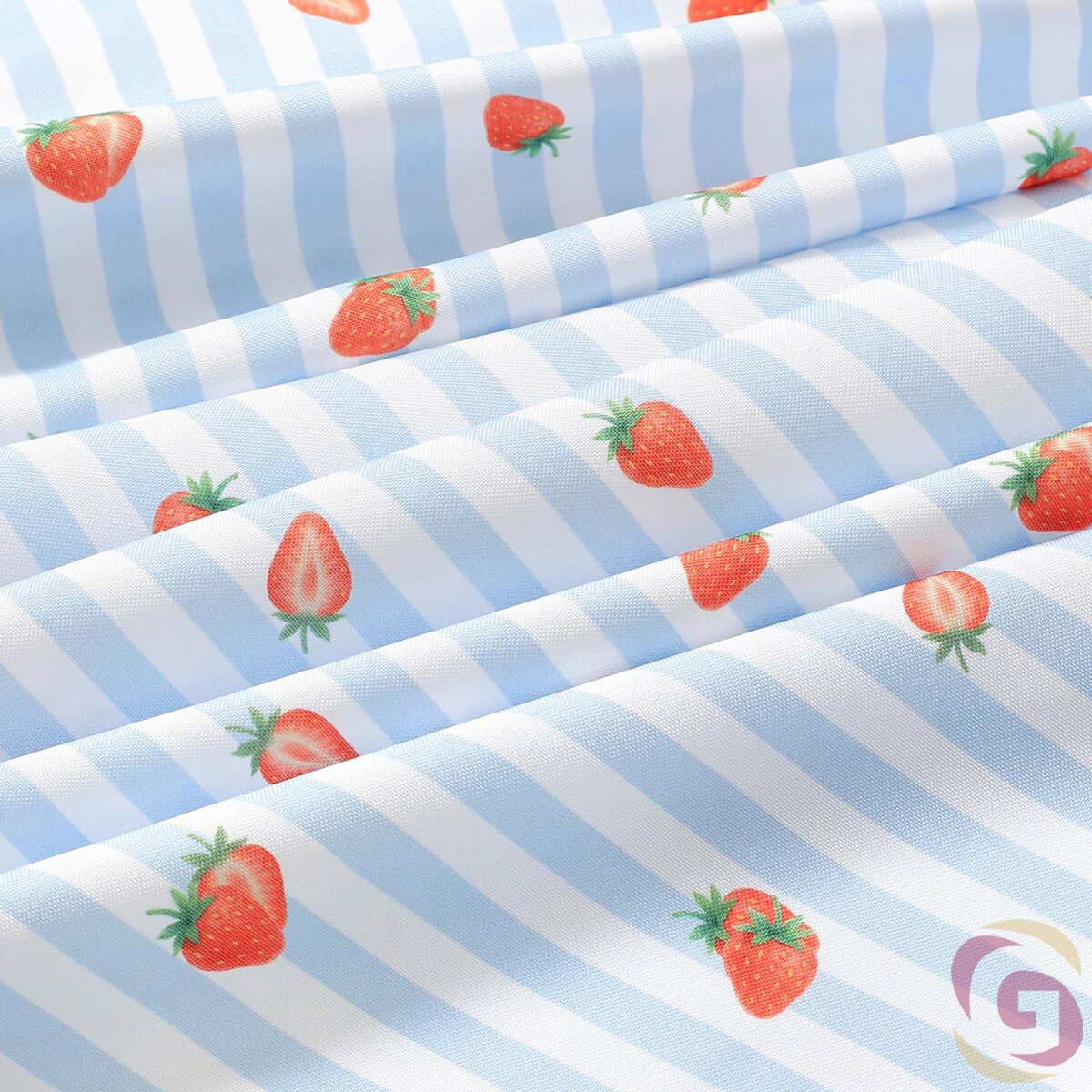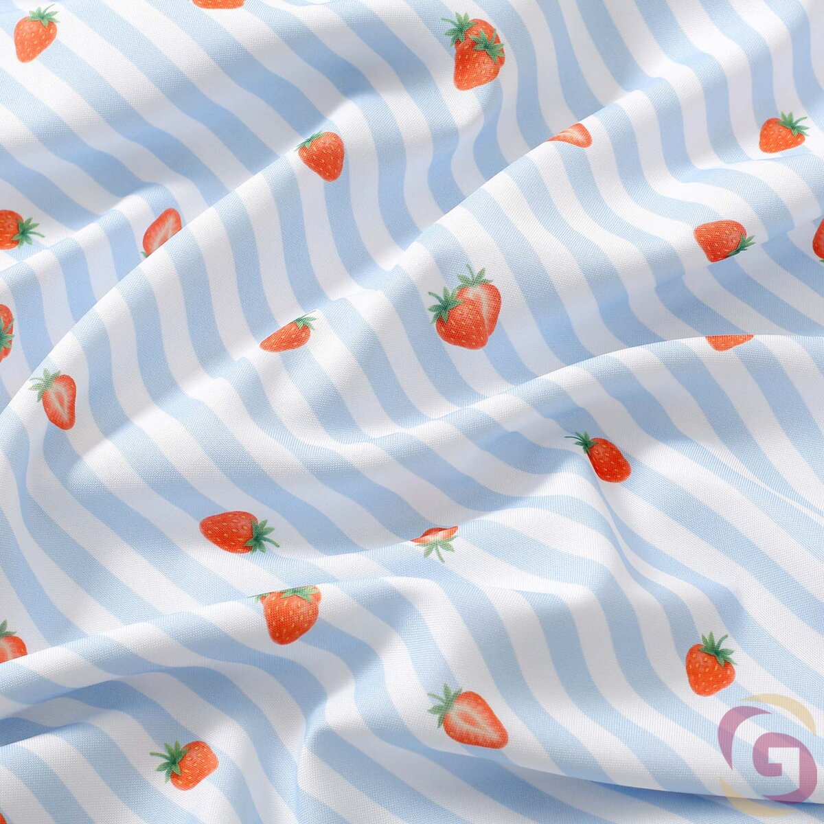 Teflonstoff für Tischdecken - blaue Streifen mit Erdbeeren