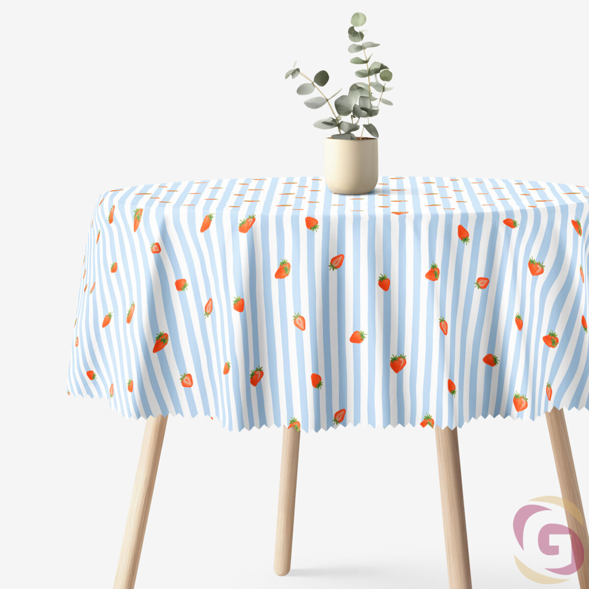 Runde Tischdecke Teflon - blaue Streifen und Erdbeeren