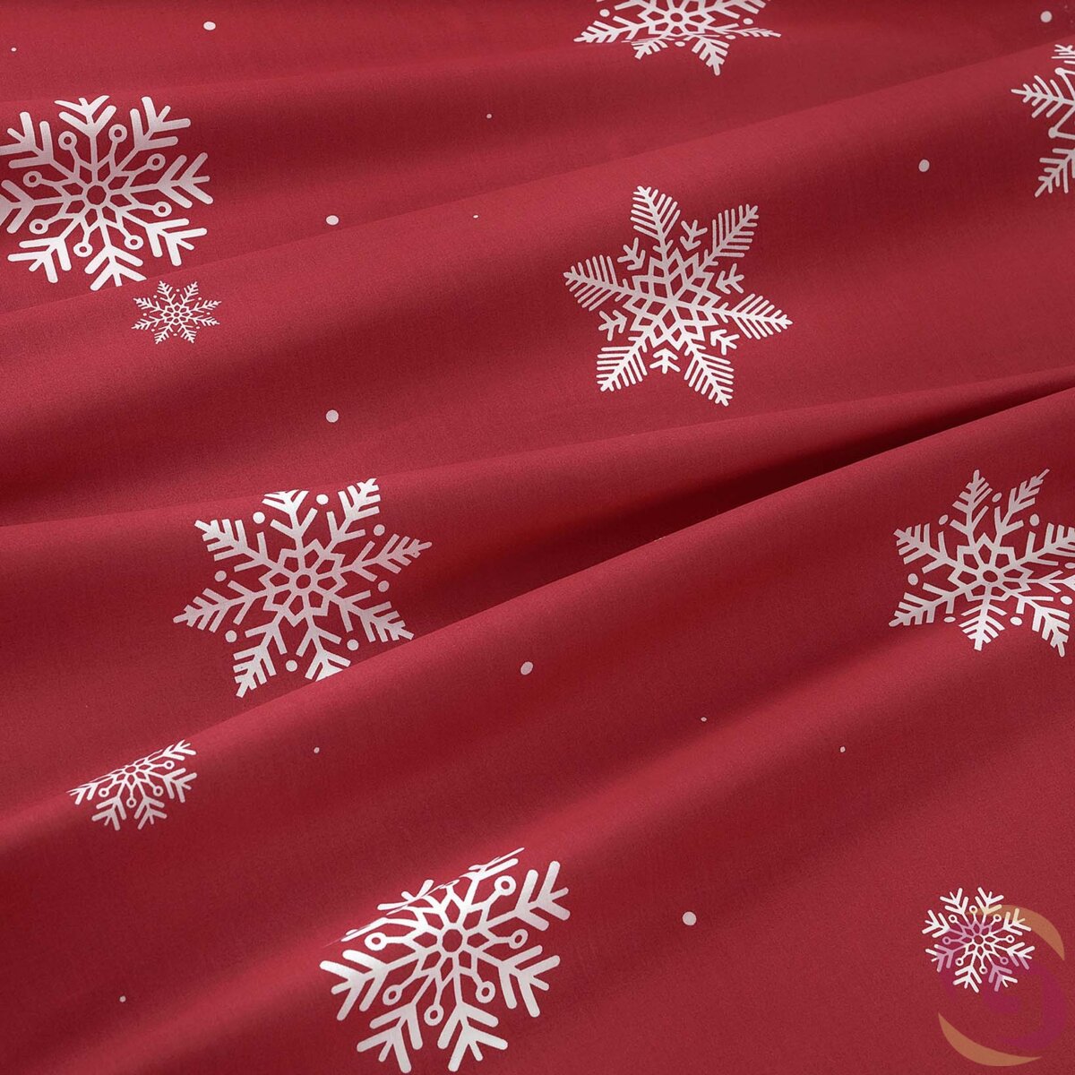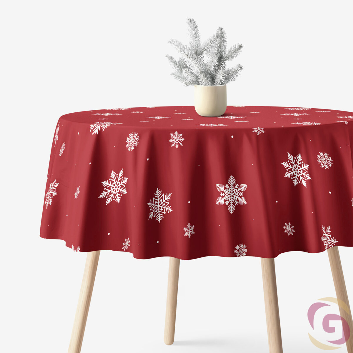 Runde Weihnachts-Tischdecke 100% Baumwolle - Schneeflocken auf Rot