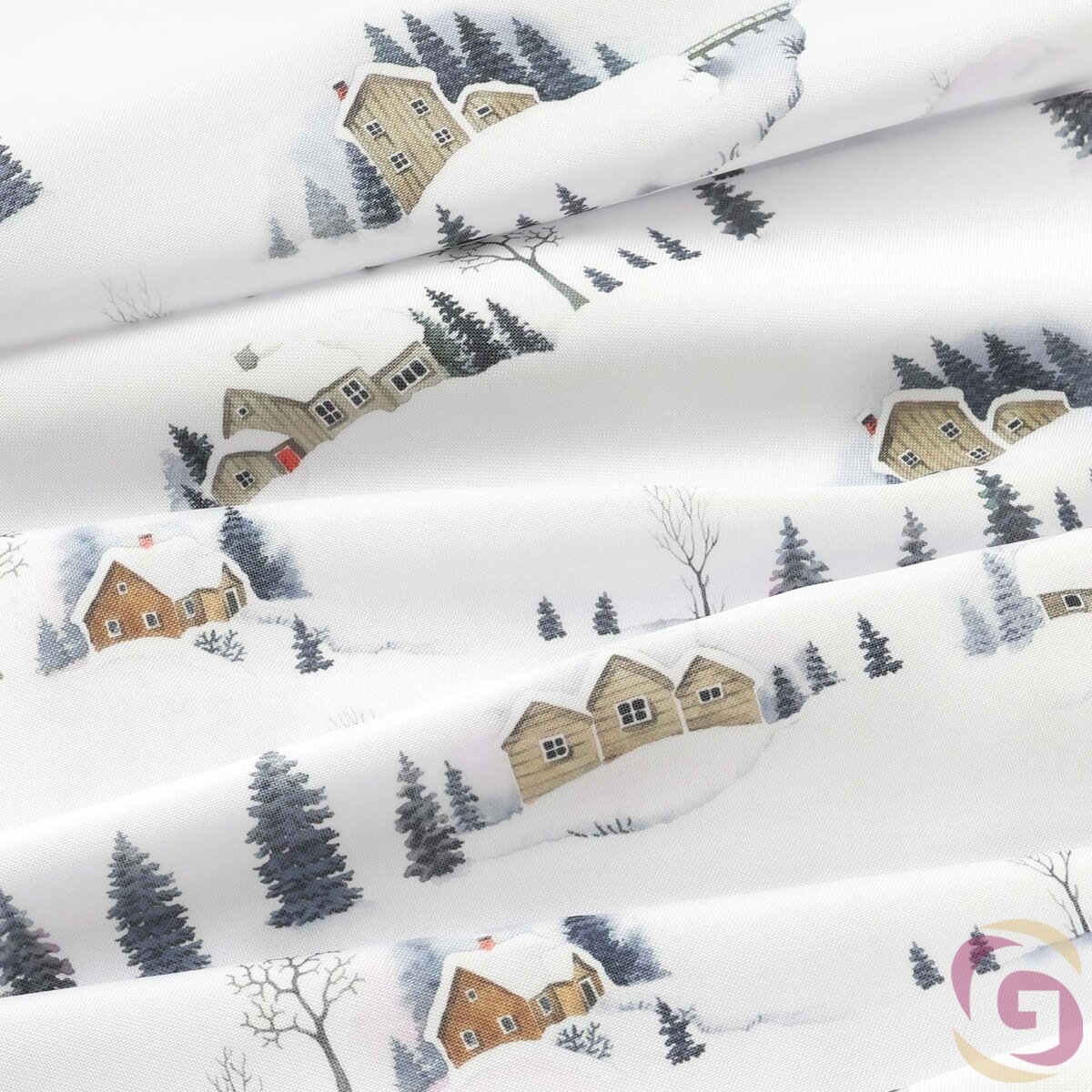 Das Muster zeigt eine malerische Winterlandschaft mit kleinen verschneiten Häuschen, die über schneebedeckte Hügel verteilt sind. Die Häuschen sind traditionell, mit schrägen Dächern. Die Gesamtpalette ist überwiegend weiß und hellgrau, mit dezenten Farbakzenten an den Türen oder Fenstern der Häuschen. Das Muster der verschneiten Häuschen bringt eine gemütliche Weihnachtsatmosphäre in Ihr Zuhause und ergänzt festliche Dekorationen perfekt.