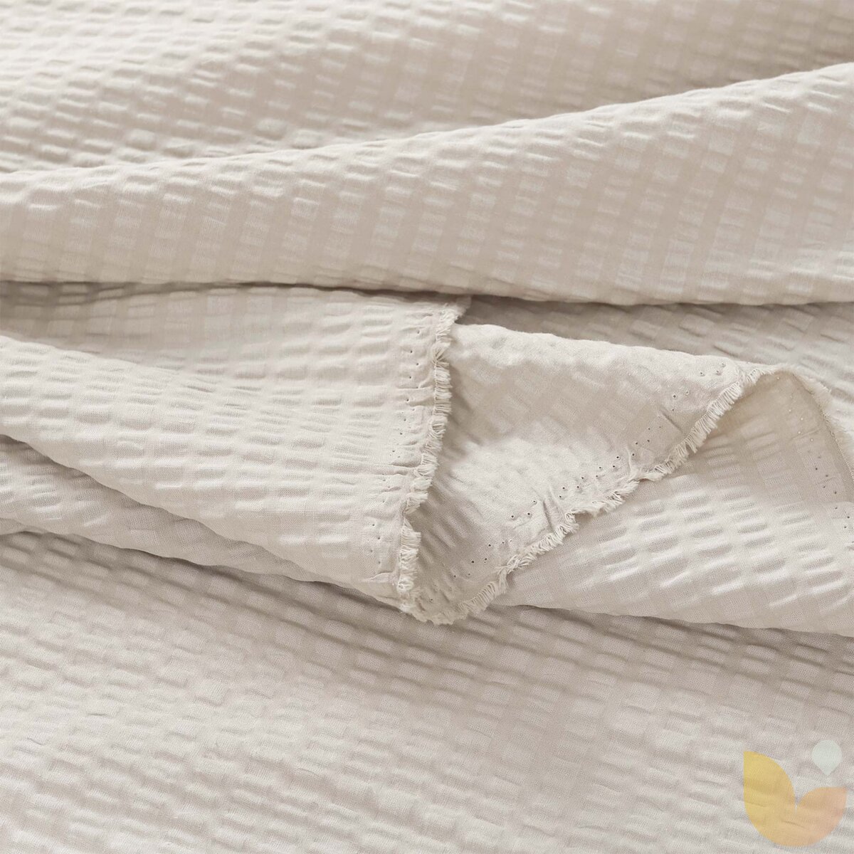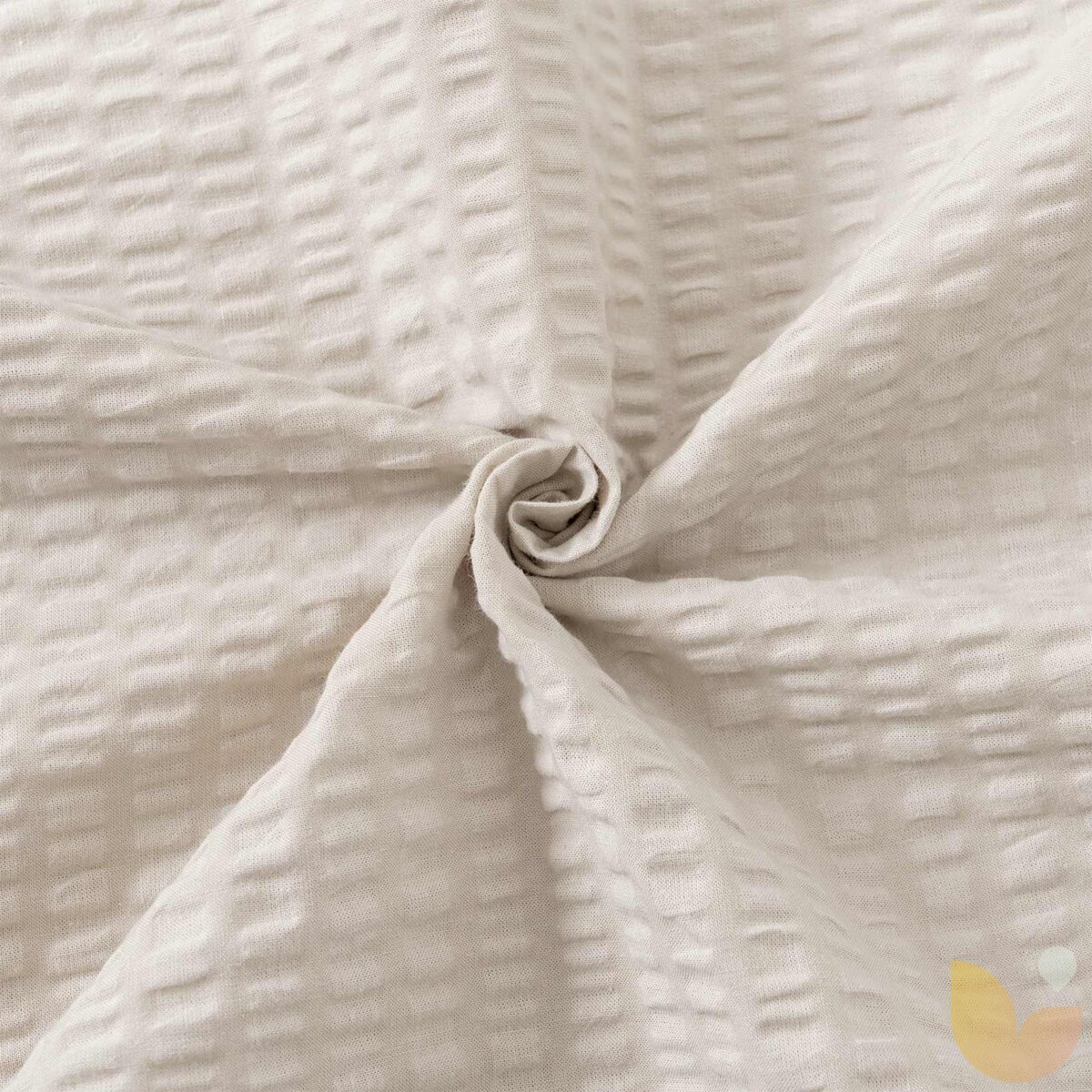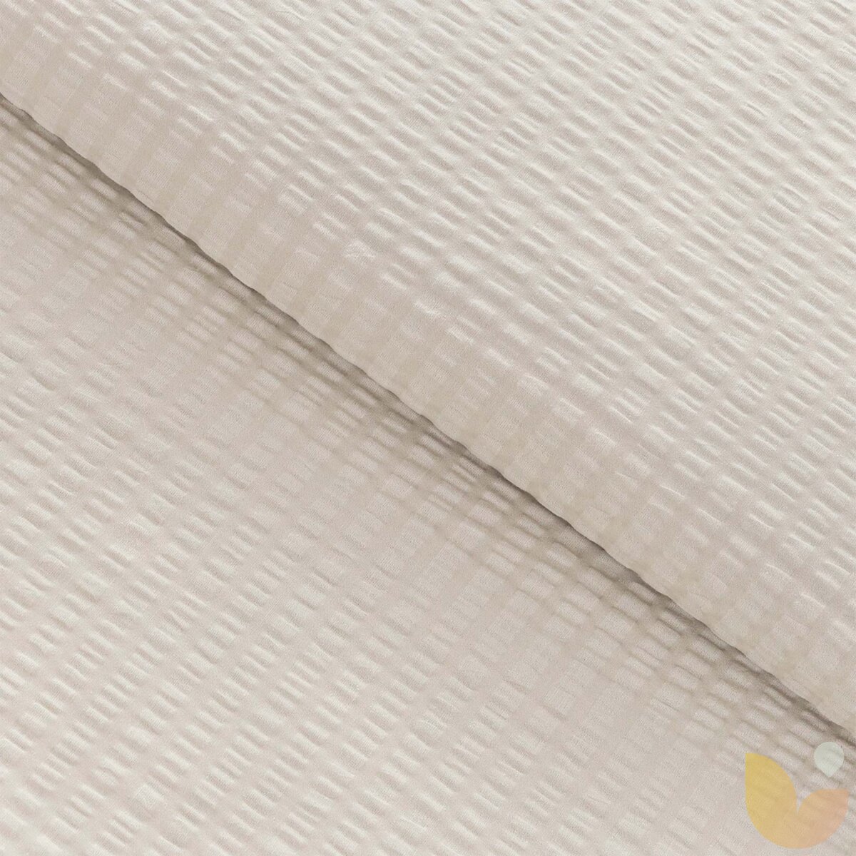 Seersucker in der Farbe latte. Die Breite des Stoffes beträgt 160 cm. Der Stoff besteht aus hochwertiger, weicher 100 % Baumwolle mit einem Gewicht von 145 g/m2 hergestellt. Es handelt sich um einen Baumwollstoff, der durch die Kreppverarbeitung eine charakteristisch gewellte Oberfläche erhält. Der Hauptvorteil dieses Seersuckerstoffs ist, dass er nichtknittert und nicht gebügelt werden muss. Wir bieten Baumwollkrepp in Meterware an, die Mindestbestellmenge beträgt 0,5 m.