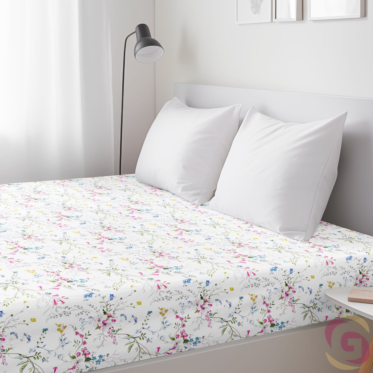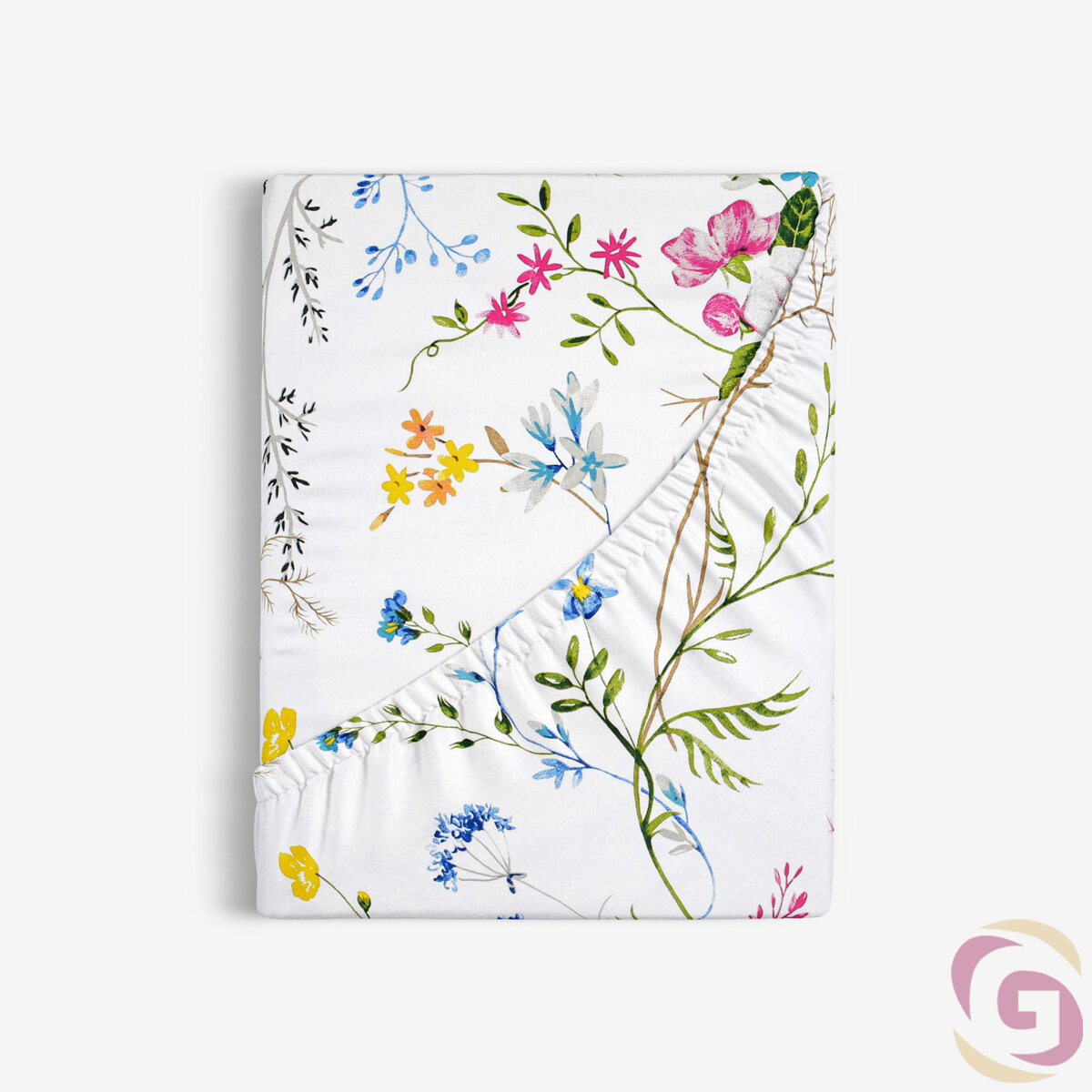 Bettlaken mit Motiv Gemalte Wiesenblumen auf weißem Hintergrund schaffen eine ruhige und ungestörte Atmosphäre in Ihrem Schlafzimmer für die bestmögliche Erholung. Dieses Spannbettlaken aus 100 % glatter Baumwolle (145 g/m²) ist mit einem Rundumgummizug versehen.